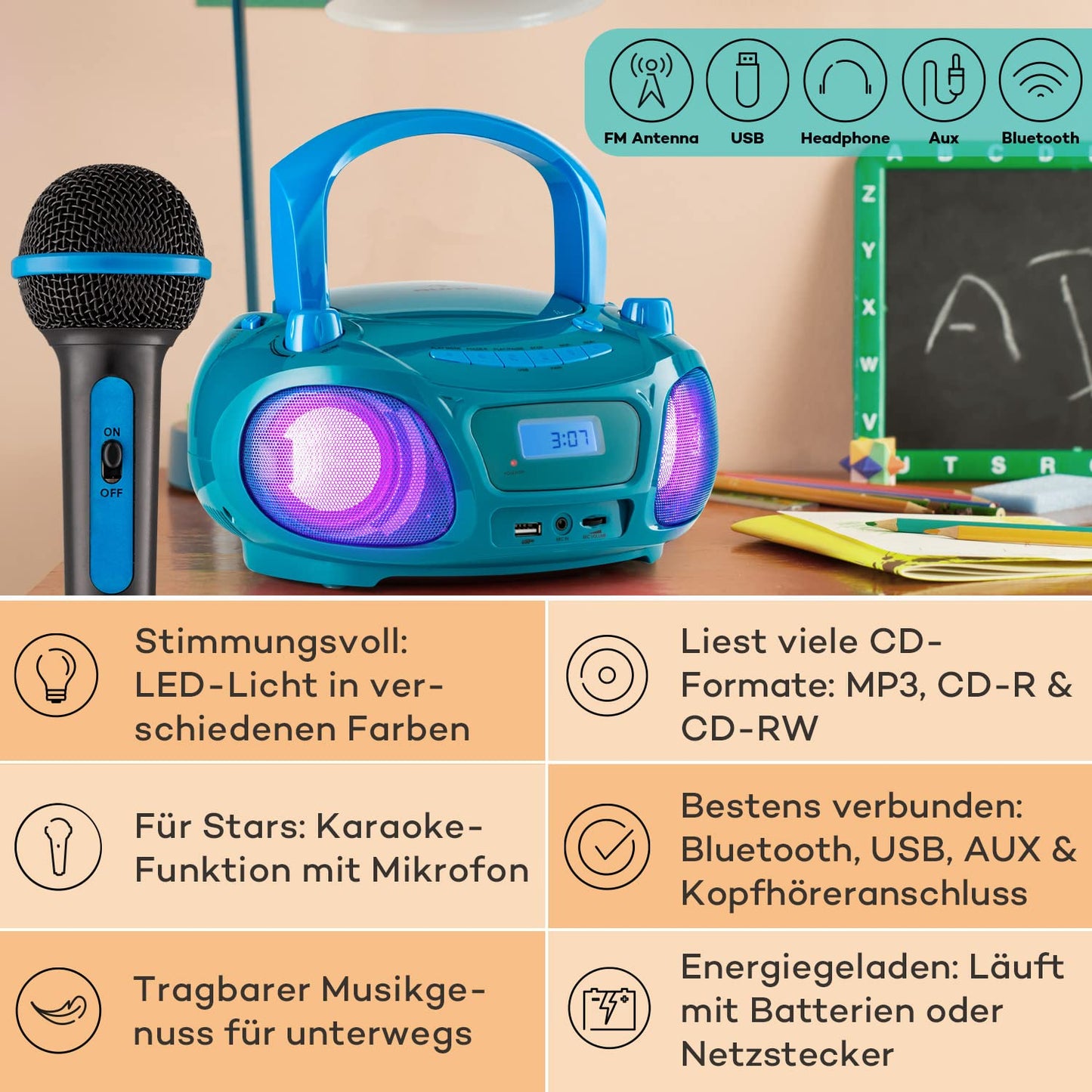 Auna portable radio for kids with CD player, microphone, and USB, 3W boombox with Bluetooth function, AUX/FM radio portable with LED display, MP3, 5.0 streaming, CD-radio for girls and boys.