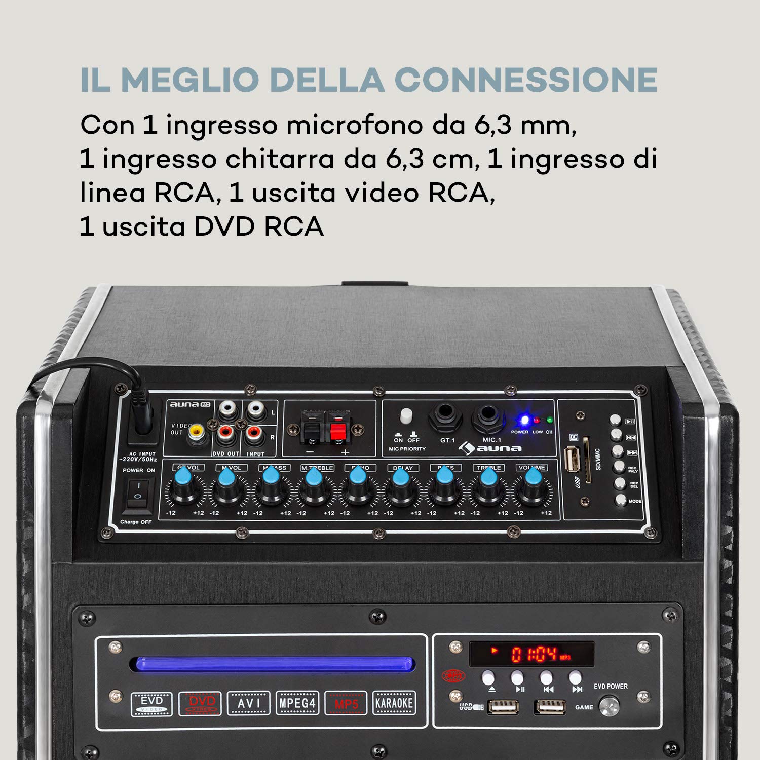 "IDEALES GERÄT: The auna pro DisGo Box DVD mobile PA system is the ideal device for all karaoke lovers. Thanks to the trolley function, an integrated DVD player, a wireless UHF microphone, and a 7A 12V battery, there are no limits to the party fun.