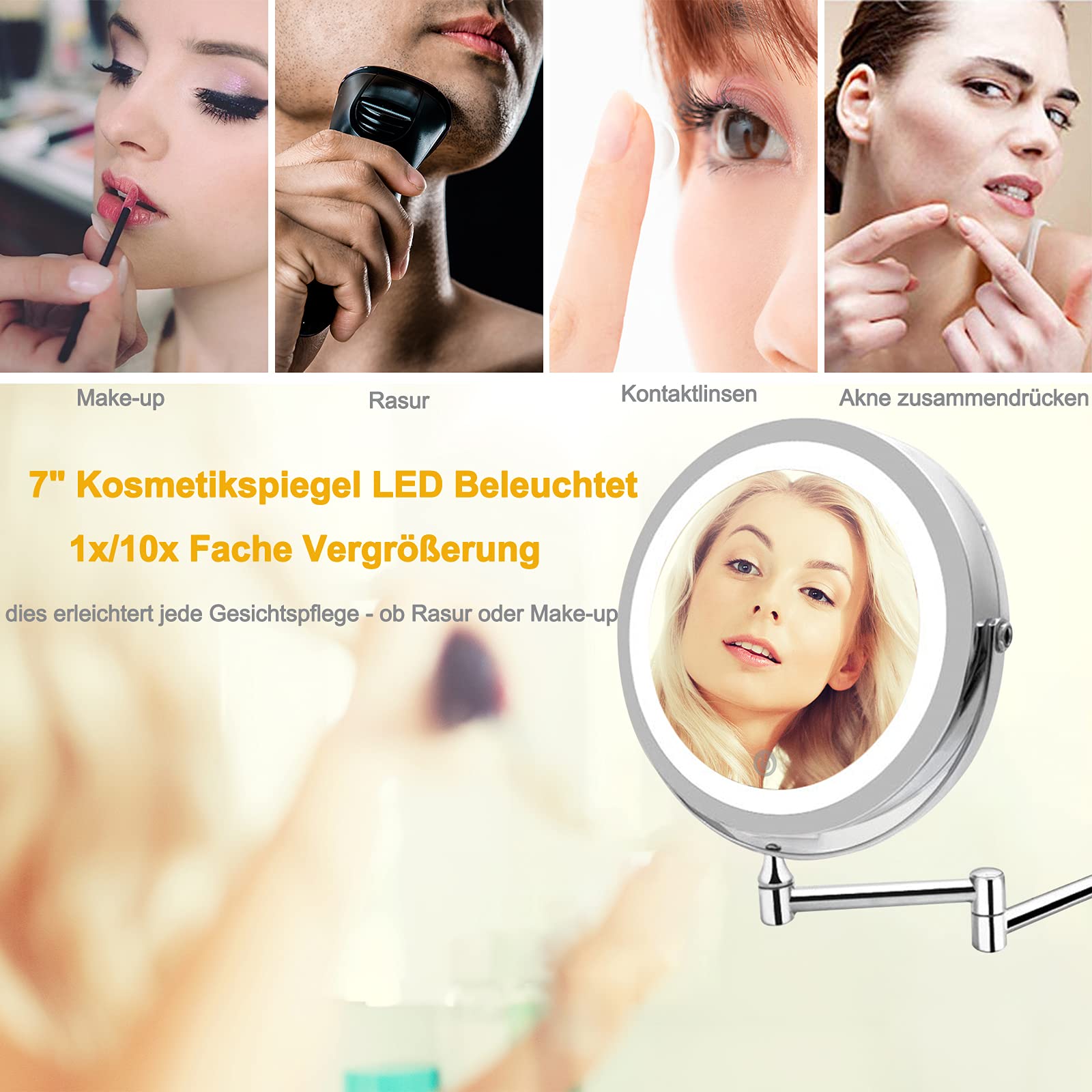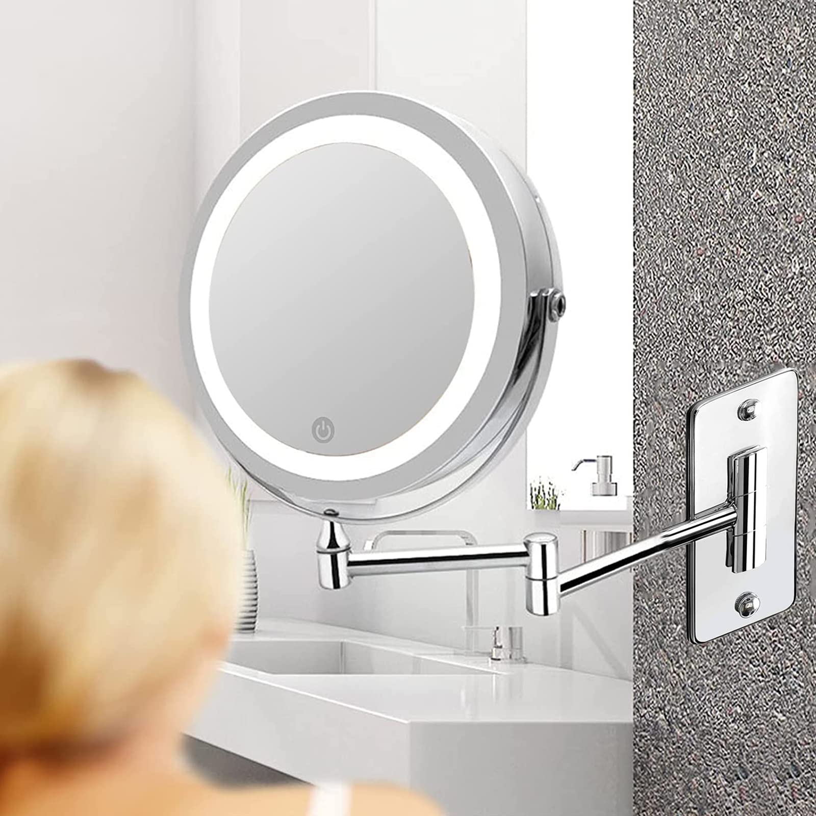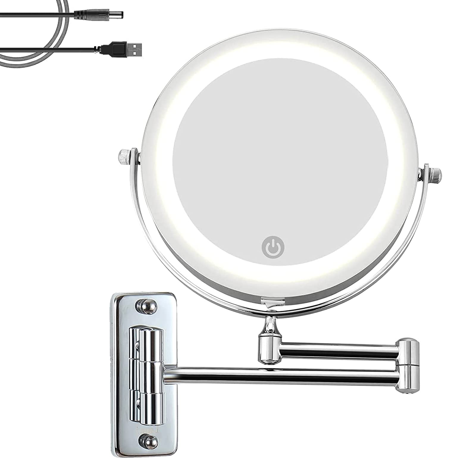 ["💡 【High-Quality Material】 Our chrome bathroom magnifying mirror is made of high-quality stainless steel with multi-layer chrome coating. It is anti-oxidation, scratch-resistant and durable in wet environments. Suitable for bathrooms, hotels, spas, hair salons, eyebrow hair removal, makeup, and inserting contact lenses.","💡 【7 Inch Big Mirror and 1x/10x Double Side】 7-inch wall-mounted makeup mirror, wide-angle view, perfect size and proportion, more luxurious and elegant. The beauty mirror has a double side, one side is a standard mirror and the other side is a 10x magnifying mirror, perfect for deep facial care, shaving, eyebrow removal, makeup, and inserting contact lenses.","💡【360° Rotating Mirror & Extendable Arm】 Flexible swivel wall-mounted makeup mirror, rotate the vanity mirror and angle to any position to get the best angle for different makeup needs. Makeup shaving mirror arm length extends up to 12 inches, can be extended and folded out of the way against the wall according to your needs when not in use.","💡【Adjustable Light】 The bathroom mirror features LED lights and 3 bright colors: warm white, natural light, and warm yellow. The brightness is also adjustable. Hold down the switch and the light on the touchscreen will get brighter or darker. You can choose the light you need.","💡【Easy to Install】 The vanity mirror comes with screws. You can use these screws to fix the cosmetic mirror to the wall. It is a great idea for home, hotel, bathroom, bedroom, etc."]
