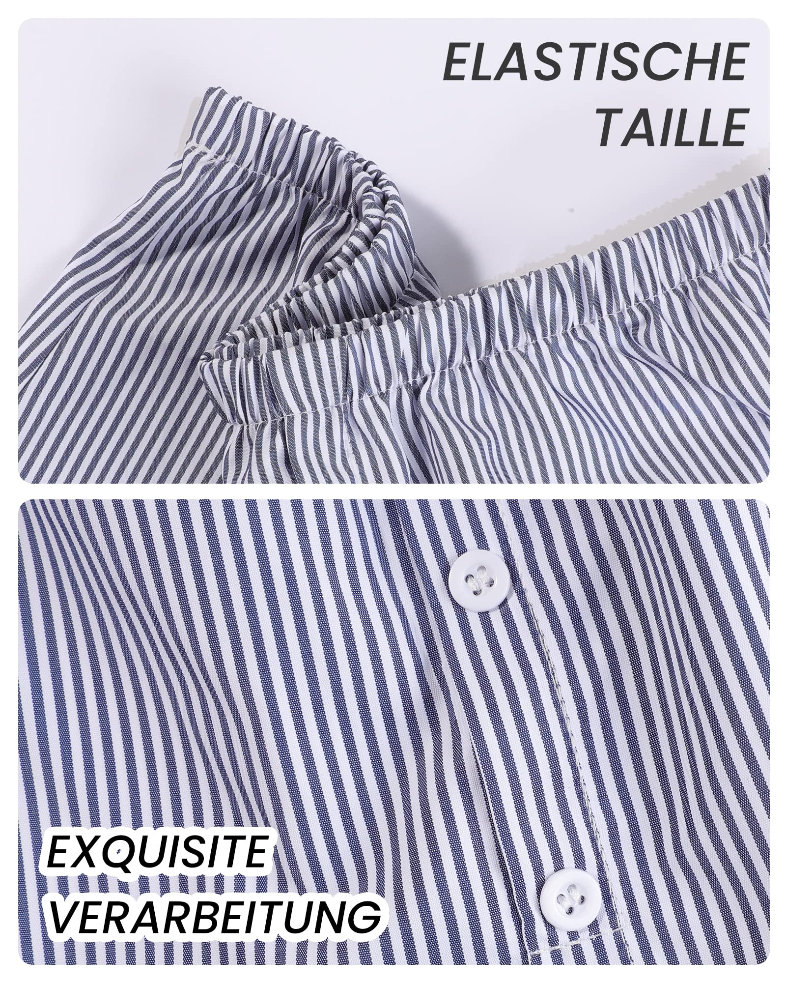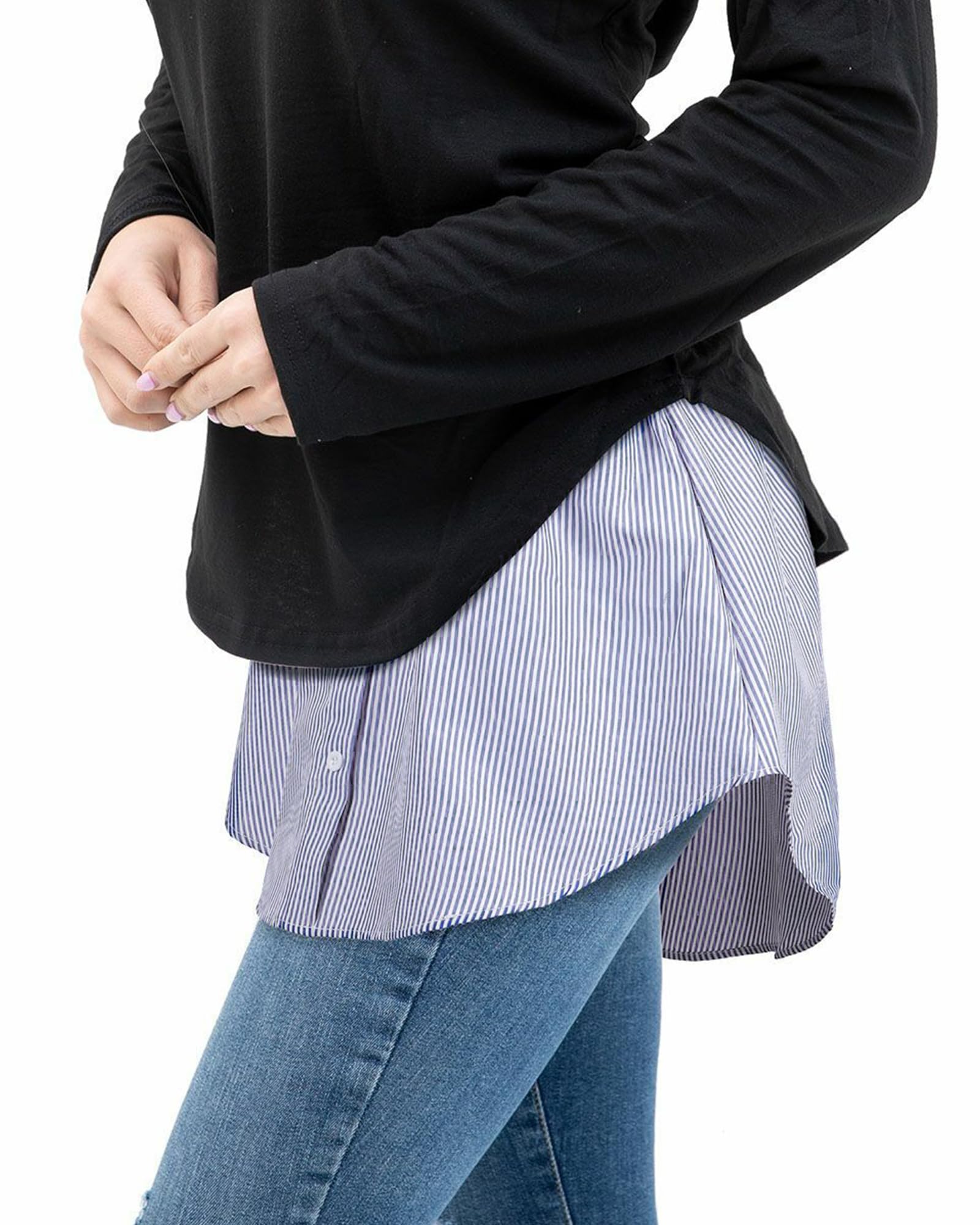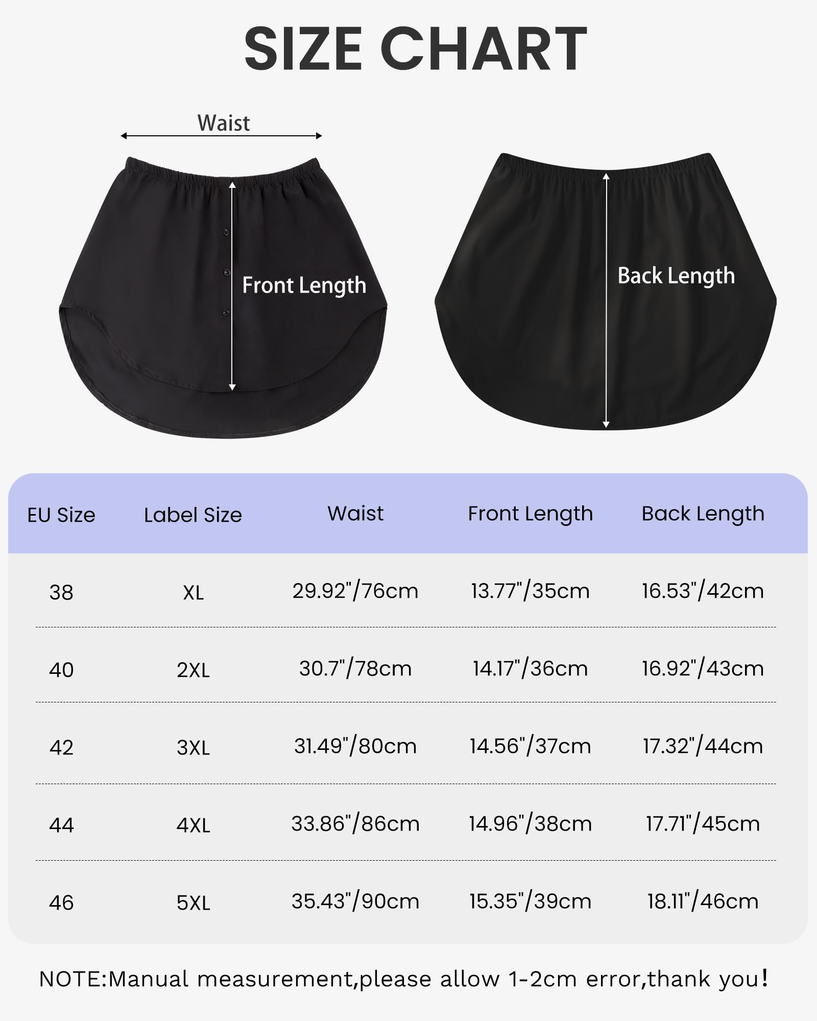 ["Sizes】XL=38(US), 2XL=40(US), 3XL=42(US), 4XL=44(US), 5XL=46(US). The size sold is the supplier's size, which differs from the EU size. Please refer to the size chart to find the correct size.","【Material】Women's blouse skirt is made of high quality 95% Polyester 5% Elastane, which is thin, soft, and breathable, light and does not feel very tight.","【Design】Women's shirt extension is the perfect layering fashion piece, with a button-down design and a mid length that adds layers and color to your daily clothes, giving you a stylish and elegant look.","【Easy to Combine】Blouse skirts come in classic colors Black, White, and Blue stripes, suitable for wearing year-round with sweaters, sweatshirts, vests, shirts, jackets, long sleeves, and coats.","【Perfect Fit】Auranso women's blouse skirt with elastic waistband protects the waist without restricting and is very easy to put on and take off. The short front and long back design is more like a real shirt for a natural and coordinated look."]