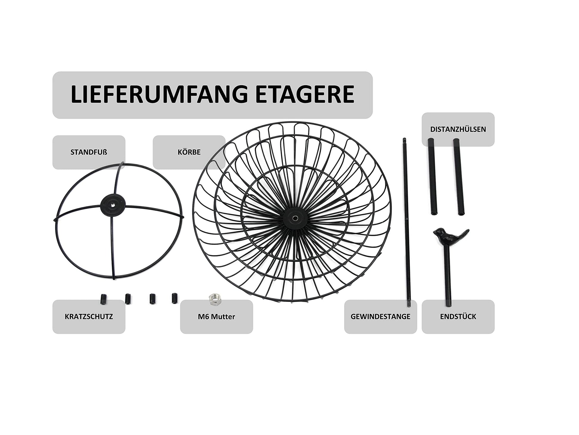 ["😊😊WARNING! If the threaded rod is screwed in too deep at the beginning of assembly, it may prevent the counterpart from being screwed on because the threaded rod appears too short. Therefore, do not screw in the threaded rod too deeply at the beginning!!! After assembly, align and bend the stand so that it is straight.", "Can be used hanging or standing as a modern kitchen helper, also versatile for buffet restaurant sales counters, stable and a great gift idea", "3 BASKETS: -11.8, -9.6, -6.5 inches; Height: 18.5 inches; offer plenty of space for fruits, vegetables, and many other decorating ideas whether in the bathroom or garden as a gift", "Find a VIDEO for assembly under Images. Decorate over 3 levels in the kitchen as a fruit plate bowl shelf kitchen decoration for cakes", "SCRATCH PROTECTION with plastic sleeves on the base for sensitive surfaces, not suitable for the dishwasher, please contact us with any questions"]