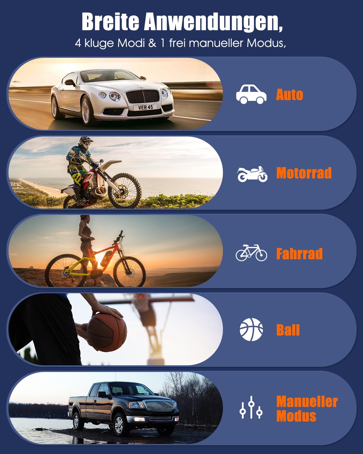 "🚗 Versatile & suitable for various applications - Ideal for cars, SUVs, motorcycles, bicycles, e-bikes, sports balls, and inflatable toys. With a full battery charge, you can fill up to 8 car tires, 14 motorcycle tires, or 60 bicycle tires from 50% to 100%. (Not suitable for large trucks or commercial vehicles.)",