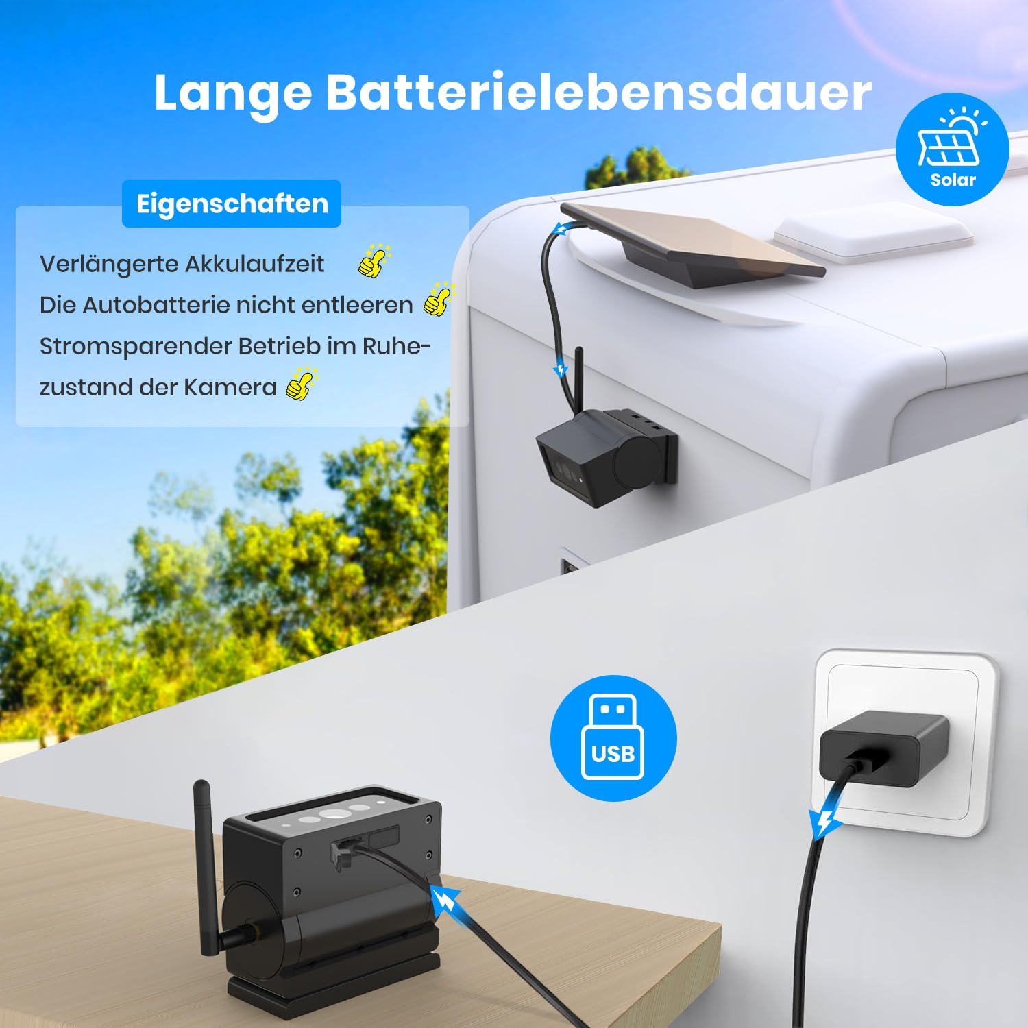 "Extended Battery Life with Solar Power: Our wireless backup camera features a solar panel that efficiently charges on sunny days, extending the battery life for long journeys. It also supports USB charging in low sunlight or winter conditions",