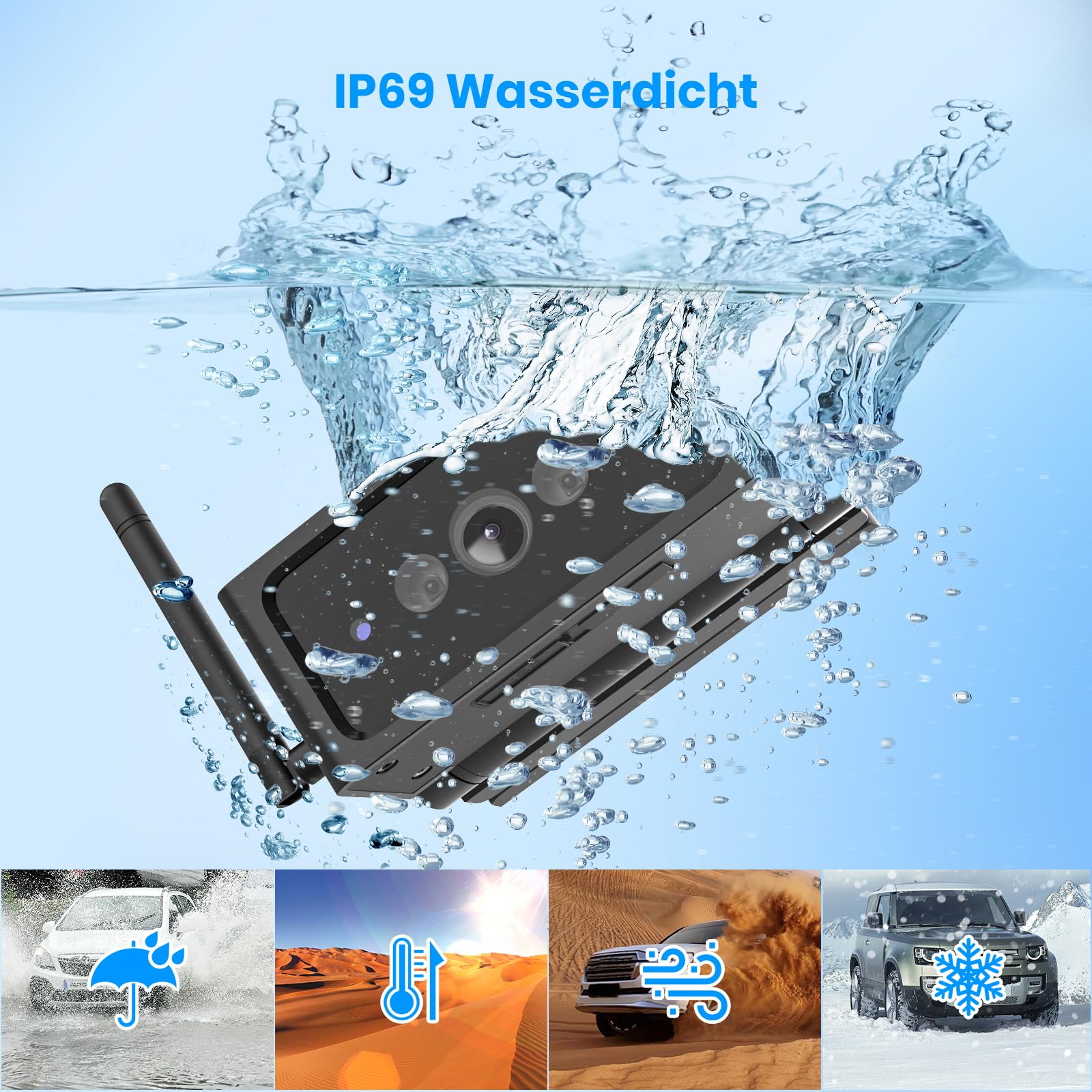 "Versatile RV Backup Camera: With an IP69K water resistance rating, the car backup camera provides clear rear views even in heavy rain. It also includes features like image reversal, brightness and contrast adjustments, and multiple language options"]
