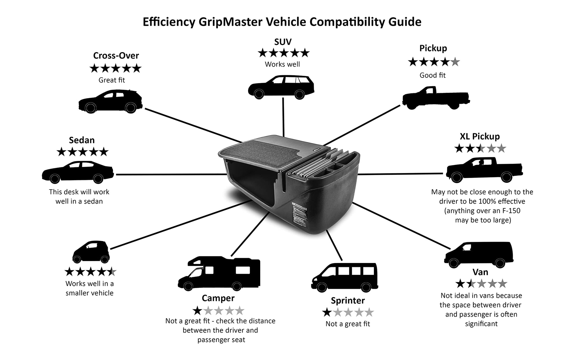["Made in the USA and designed to be used in a vehicle to support writing and working with a laptop or tablet, making it an ideal tool for the mobile office worker","Increase productivity by keeping your vehicle organized and efficient, with a large work surface and smaller storage compartments located on the back of the desk","The desk is designed to be strapped into the passenger seat and is easy to remove or install","The surface of this desk is coated with non-slip rubber to ensure that your laptop, briefcase, or phone does not slide around while the vehicle is in motion","Hidden storage compartment beneath the desktop conceals laptop, tablet, smartphone, and folio out of sight"]