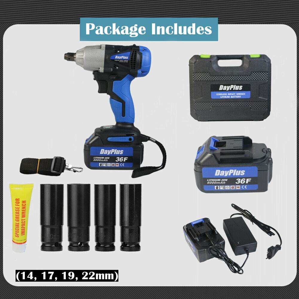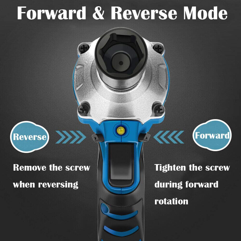 ["Powerful Battery-Powered Impact Wrench - Powerful torque easily loosens nuts, bolts, or screws from motorcycles, bicycles, and machinery projects. With a 6.0Ah Lithium battery, the impact wrench provides more power for longer life.", "Multifunctional Battery-Powered Impact Wrench - 1/2\" square chuck for screws and nuts. Brushless motor for more endurance, longer life.", "2-Speed and 420Nm Torque Design - Impact wrench equipped with 2-speed adjustment: idle speed: 0-2300 rpm, thread diameter: 4-26 mm. The 18V impact wrench has a huge torque of 420Nm at speeds of up to 2900 rpm. Strong impacts for easy screwing and loosening. Variable speed control through trigger.", "Personality Design - Forward/reverse operation; LED job light illuminates the work area in dark conditions.", "You can get - 1 × cordless impact wrench, 1 × 6.0Ah battery, 1 × fast charger, 4 × socket (17/19/20/22 mm), 1 × belt buckle, 1 × lubricant, 1 × toolbox."]