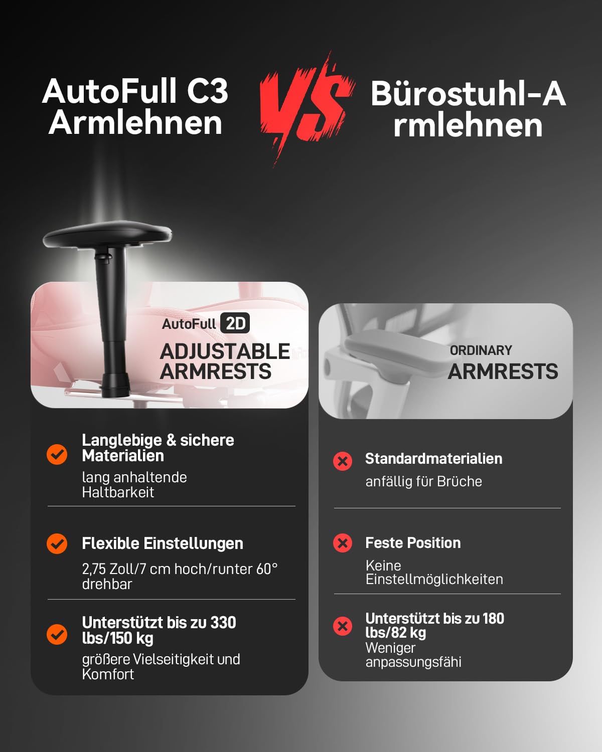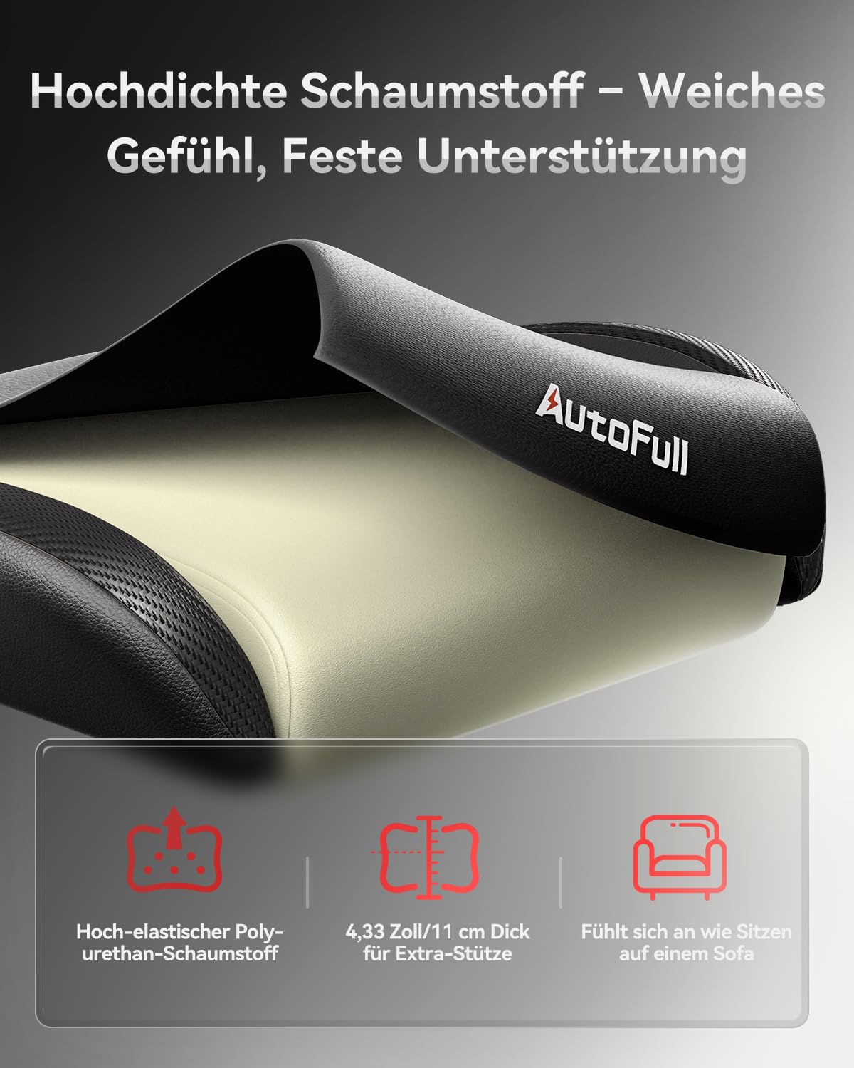 "Super materials, super feel: The AutoFull C3 gaming chair has an amazing weight of 25.7kg, which is 20% heavier than chairs from other brands. Our chair features a uniform full steel frame reinforced with high elastic bandage and filled with high-density foam, which improves the stability and comfort of the chair. The SGS Level 4 certified gas cylinder and explosion-proof chassis provide additional safety and stability."