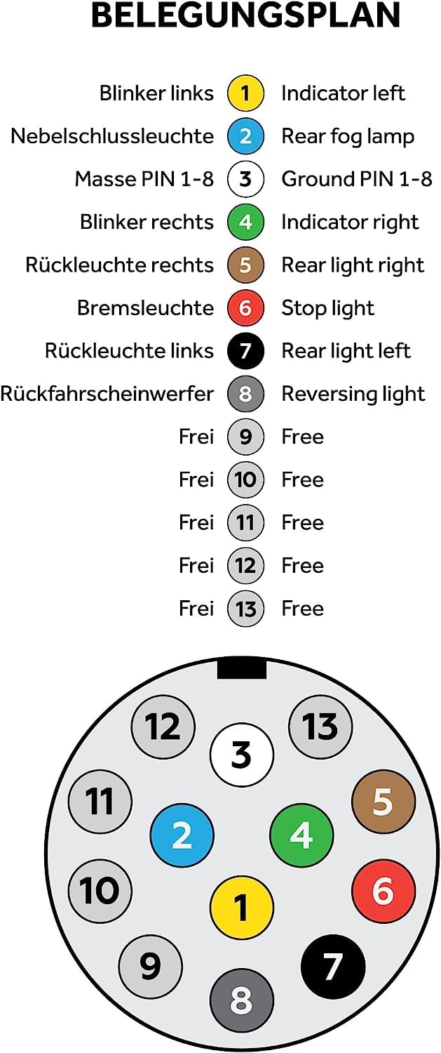 ["Easy Installation: The plug-and-play cable harness allows for quick and easy assembly. With the bayonet connector system, the tedious and time-consuming wiring of the lamps is completely eliminated. You can easily connect the cable harness to your car trailer without any specialized knowledge or time-consuming installation steps.","Reliable Power Supply: This 5-meter cable harness reliably powers the lighting of your trailer. With a 13-pin plug, which is 8-way connected, and 2 x bayonet connectors, it provides sufficient power and ensures a stable power supply for your trailer lighting. The cable harness does not have a connection for an additional position light and is not suitable for continuous power or charging lines.","Splash-proof: The cable harness has a splash protection rating of IP67. This means it is protected against water ingress and functions reliably even under damp conditions. You can safely use the cable harness in rain or when driving through puddles.","Versatile Applications: The cable harness is universally suitable for car trailers, trailers, caravans, horse trailers, boat trailers, jet ski trailers, and other types of trailers. Whatever trailer you own or use, this cable harness provides a suitable solution for powering the lighting.","High Quality and Durability: The cable harness is specifically designed for use in trailers and offers high quality and durability. With sturdy materials and careful craftsmanship, the cable harness is designed to withstand the stresses of the road and provide you with a long-term solution for powering your trailer."]