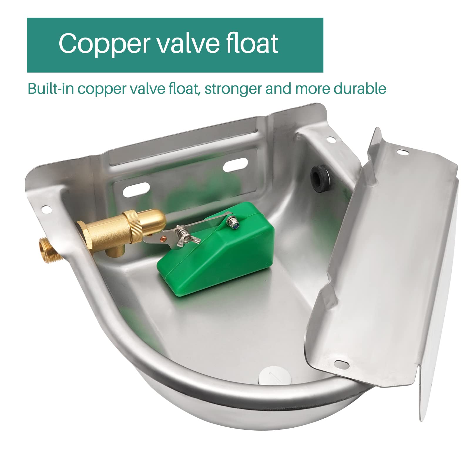 ["DURABLE MATERIAL: This automatic float valve water bowl is made of 304 stainless steel, which is resistant to deformation and rust; the inner float valve is made of brass valve + plastic float material, strong and resistant to water corrosion and durable. The drinking bowl is polished and smooth, with fine workmanship to avoid animal scratches.","AUTOMATIC DESIGN: Using the principle of the floating ball water level, control the water inlet and outlet switches to achieve a constant water level effect, and the cows can get fresh water anytime they need it.","SAFE AND STABLE: There are 2 mounting holes on the back for securing this water dispenser to the wall (mounting screws not included); Polished and curved edges, the installation is secure and does not easily fall off, ensuring safety.","LARGE CAPACITY: 27 x 28 x 10 cm; 4 l stainless steel water bowl with large capacity is enough to meet the drinking needs of livestock and save time.","WIDE RANGE OF USE: suitable for automatic drinking fountains for dogs, pigs, horses, alpacas, cows, goats, and sheep, a good helper for livestock farms!"]