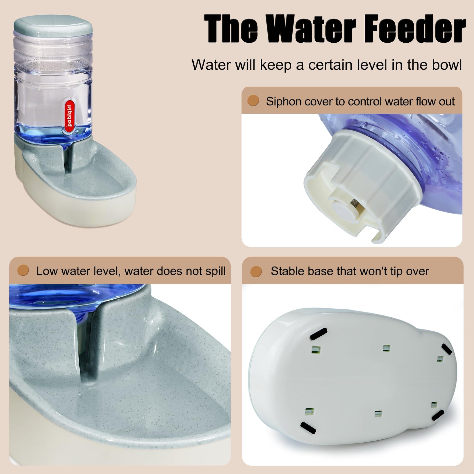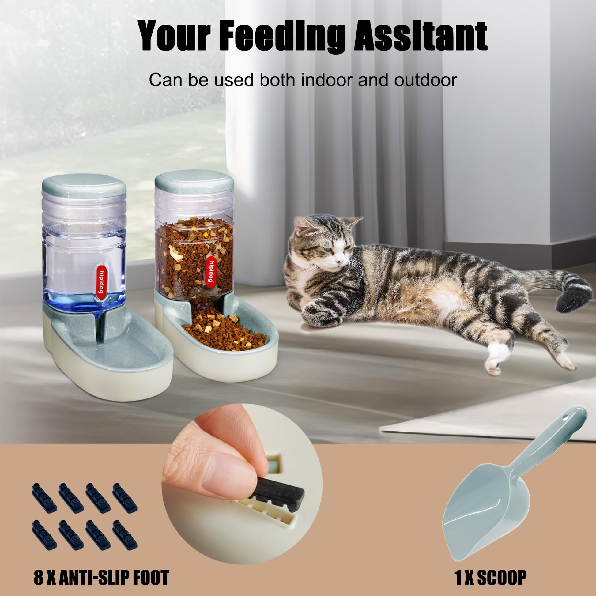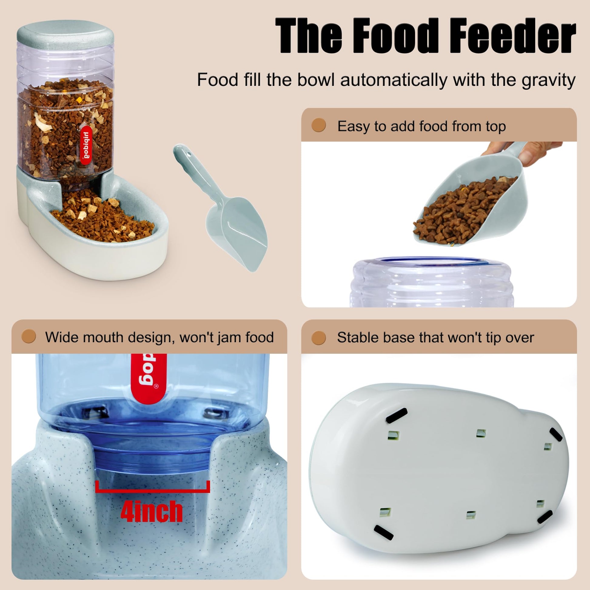 ["1. Automatic Feeding and Watering System: natural gravity supply system, no electricity required, eco-friendly and can be used anywhere.","2. Size and Capacity: Both the feeder and water dispenser measure 32 x 21 x 32 cm; large capacity of 3.8 l, holds approximately 7 days for small pets, 3 days for large pets, you can confidently go on vacation, to work, to parties without worrying about pets being hungry.","3. User-friendly Design: side cutouts for easy lifting and cleaning, non-slip rubber feet for secure placement.","4. Easy to clean: Barrel and housing of the automatic feeder can be separated, you can rinse directly with water, it is recommended to wash once a week.","5. Material: BPA-free. Made of environmentally friendly, non-toxic plastic. Protect the health of your pet."]