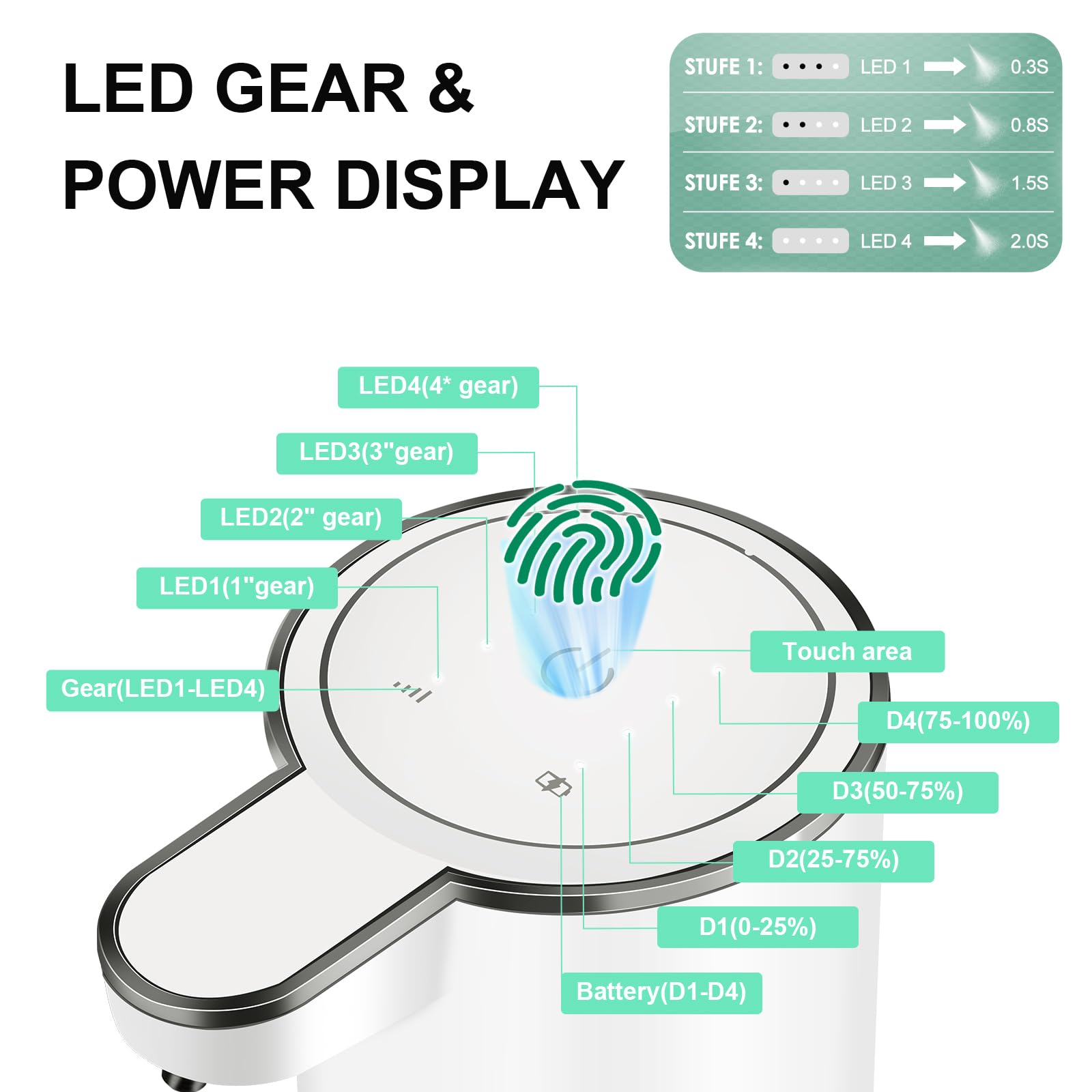 🤲USB-C RECHARGEABLE AND BATTERY INDICATOR: The electric soap dispenser is rechargeable, no need to replace batteries, economical and environmentally friendly. 4-gear battery indicator makes it easy to know how much energy is left.