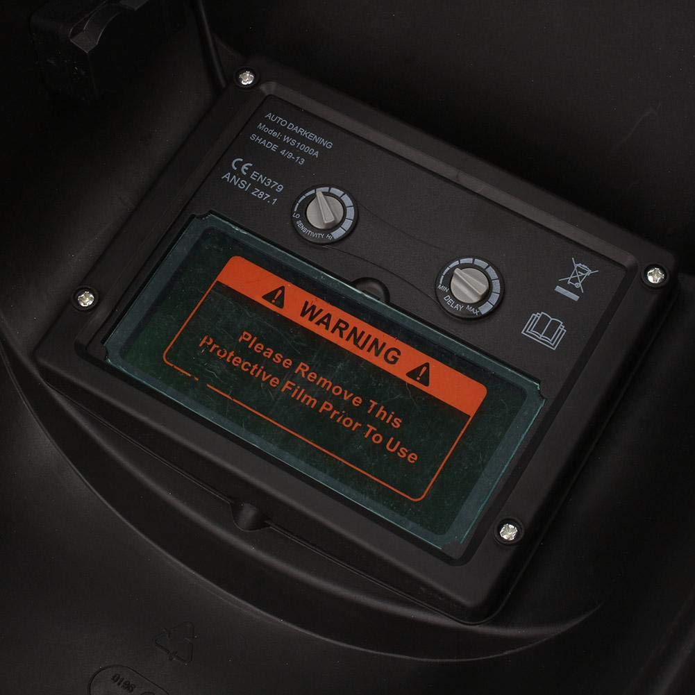 ["Automatic Darkening】This welding helmet can automatically darken the filter, switching from light to darkness. In case of power failure, the welder is protected from UV and IR radiation.","【Clean and Comfortable Visibility】With a standard viewing size of 1.97" x 4.33", light diffusion, light transmittance, and angle dependence allow the welder to see clearly from various angles.","【Solar Cells and Lithium Batteries】The lens of this welding helmet is powered by solar cells and lithium batteries, no batteries required.","【Fully Automatic On/Off】This welding helmet is equipped with sensitivity settings and time settings for adjusting to different environments and work times.","【Wide Application】This welding helmet is suitable for various work environments, such as automotive, construction, food and beverage manufacturing, metal manufacturing, maintenance, etc."]