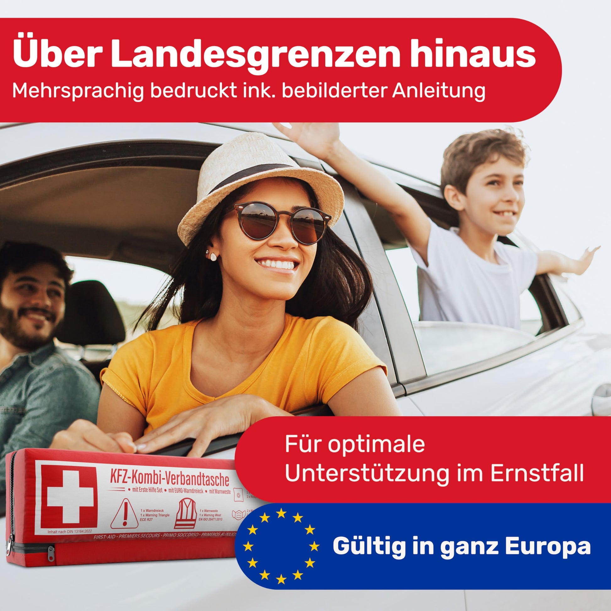 ["EUROPAWEIT NUTZBAR - The 3 in 1 First Aid Kit meets the latest 2025 standards and is approved for use on all EU roads. Drive flexibly and worry-free with this kit!",