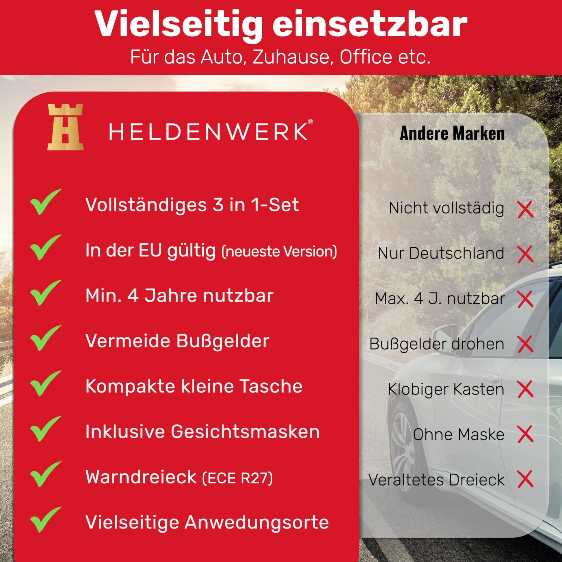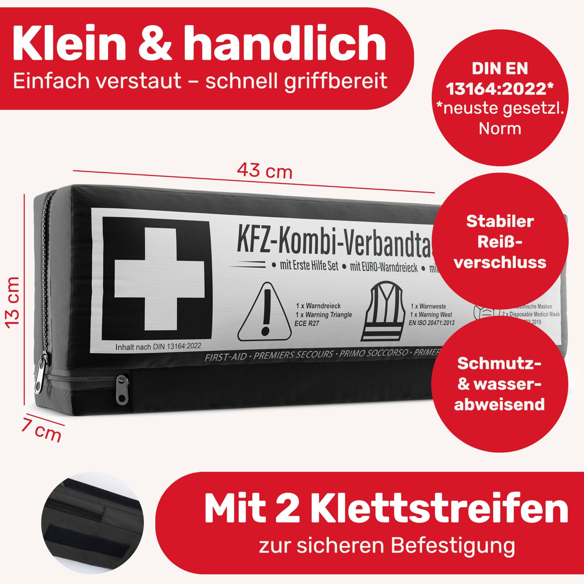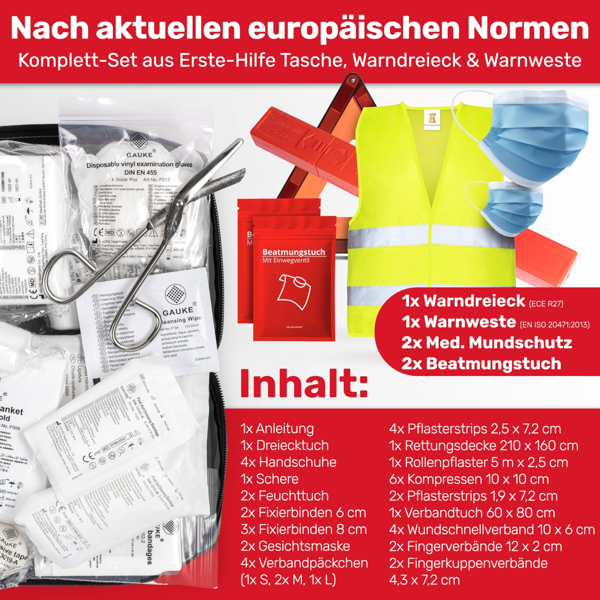 ["EUROPEAN-WIDE USE - The 3 in 1 first aid kit meets the latest 2025 standards and is approved for all EU road traffic. Drive flexibly and worry-free with this kit!","SAFETY & PROTECTION - With bandage materials including 2 face masks and a highly reflective warning vest, this roadside assistance kit is versatile. The warning triangle is ECE-compliant and packaged in a separate plastic box.","AVOID FINES - Having a standard first aid kit is mandatory under §35h StVZO. With the latest 2025 regulations, this car first aid kit will get you through any inspection and breakdown across the EU.","WELL-PROTECTED - The contents of the sturdy first aid bag are dust-proof and sterile. Rigorous quality controls make your car first aid kit a 100% reliable travel companion.","HANDY VELCRO STRIPS - The first aid kit features 2 convenient Velcro strips for attachment in the car. With a separate compartment for the warning triangle, everything stays organized in emergencies"]