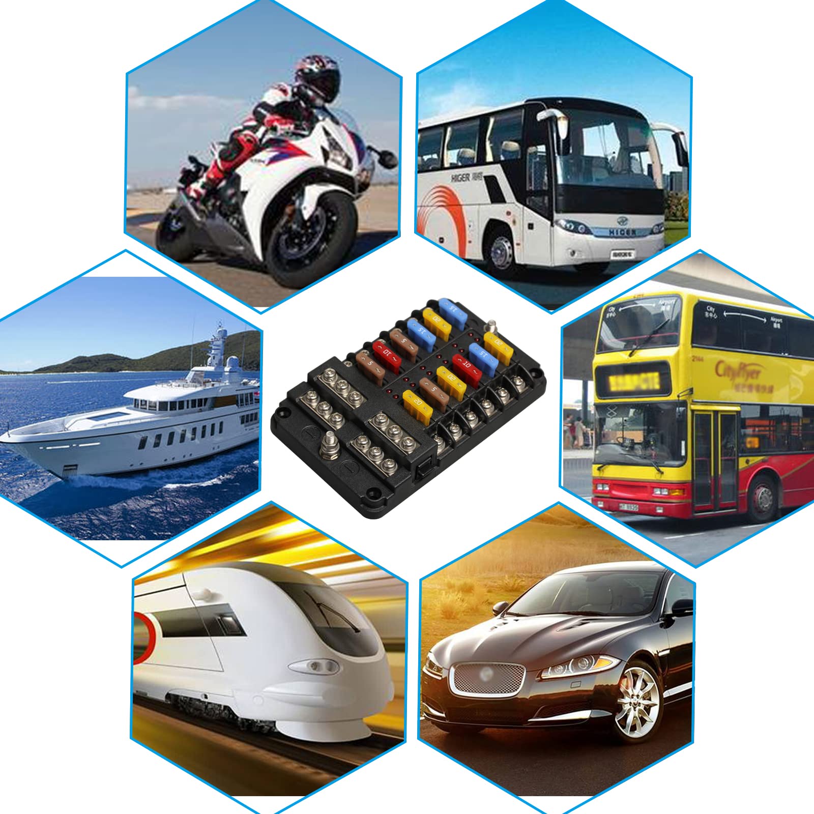["The 12v automotive fuse holder: 12v distribution block for vehicles is designed to operate at a voltage of 12v, 24v to 32v and is suitable for motorcycles, tractors, trucks, cars, motorhomes, boats, campers, torpedoes, vehicles, and marine equipment. The 12 volt automotive fuse box 12v has independent circuits and a terminal block for the 12v fuse block to ensure that each device placed in the marine DC fuse box receives the safest protection","The DC automotive fuse holder 12 volt installation with car battery warning indicator: When the current is high, the fuses burn out by themselves and the red LED light illuminates. The outer cover of the car fuse box 12 volt voltage distributor blade fuse holder is transparent. It is easy to see the circuit status of the fuse box distribution box, quickly locate where the malfunction is in the circuit, and replace blown fuses immediately","The circuit distributor 12v automotive fuse holder 12-way blade fuse box is made of safe, environmentally friendly PBT material. The external screw-in fuse box automotive fuse holder blade fuse panel is mechanically strong, insulated, heat- and flame-resistant. It will cause almost no breaking, deformation, burning, or short-circuit phenomena. Nameplates for DIY electrical devices are provided. Testing and repairs are convenient","The automotive fuse box 12v boat is equipped with a transparent plastic cover to provide additional protection to the product. It is easy to install and convenient to clean. Car fuse holder 12v consolidate branch circuits and eliminate the clutter of inline fuses for electronics and other devices. The flat plug automotive 12v distribution fuse box motorhome positive and negative poles meet the requirements of ABYC/USCG and protect electronic devices","The universal power distribution box power distribution 12v can be widely used to control car lights, headlights, wide lamps, fog lights, warning lights, motorhome refrigerators, chargers for car fans, and car TVs, etc. This package with flat fuse holder camping power distributor 12v board includes: 1 x car blade fuse distribution 12v set, 6x20A fuse, 6x15A fuse, 6x10A fuse, 6x5A fuse, 2 x equipment nameplates, 4 x screws"]