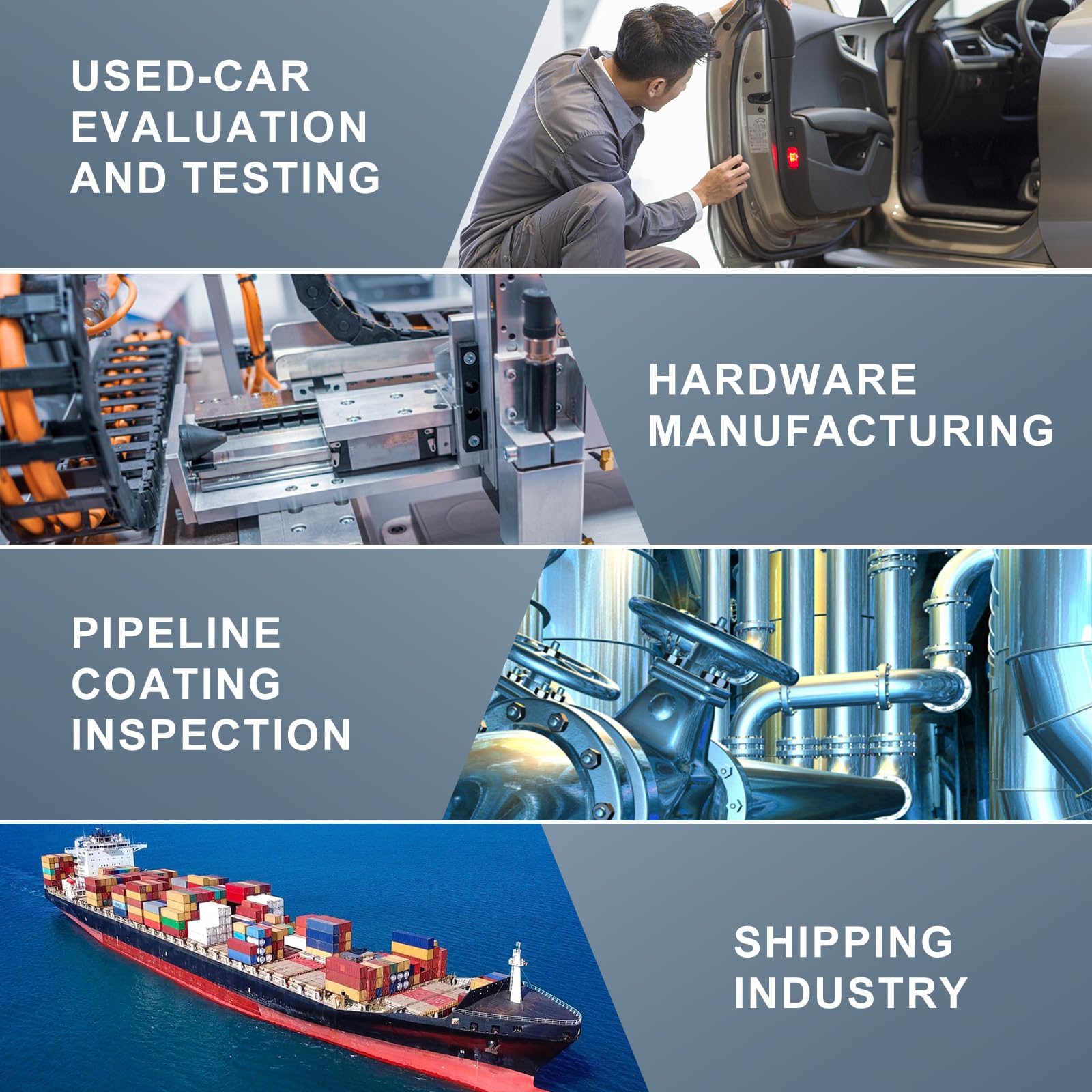 ["【Exact Measurement】- DURFICST Coating Thickness Gauge with highly precise probe; Measurement range: 0~1500μm (0~59.1mils); Resolution: 0.1um/0.01mils; digital LCD display, clear reading; automatic shut-off function; Accuracy: ±3%; Measurement units: μm and mil. DURFICST "CT02" paint thickness gauge for the most accurate measurement results!","【Large Display, Automatic Fe/NFe Detection】- The DURFICST "CT02" color depth gauge is equipped with a high-contrast LCD screen with cool white backlight and high-resolution data display. It is a dual-function thickness gauge with magnetic induction and eddy current measurement, automatically recognizing iron (Fe) and aluminum (NFe) substrates, allowing you to easily measure various coating thicknesses.","【Multifunction】- The car paint thickness gauge offers two measurement modes to choose from: single-point measurement / fast continuous measurement. Maximum and minimum value lock function; Maximum and minimum threshold alarm function; automatic shutdown after 10 minutes without operation. Zero point calibration and multi-point calibration. Compact and portable, it is the ideal partner for DIY enthusiasts and professionals in the automotive industry.","【Versatile Applications】- The DURFICST "CT02" paint film thickness gauge is a highly precise and compact device for fast and accurate measurement of the thickness of coatings or overlays on almost all metal surfaces. The device is used to determine the average thickness of body paint and is used by amateurs and professionals in manufacturing, workshops, paint shops, and the automotive industry.","【Reliable Assistant for Used Car Inspection】- Sometimes body shops hide everything well from the eye and cannot recognize that the car has had a serious accident. When buying a used car, use the DURFICST "CT02" automotive paint thickness gauge to check the paint and control the actual condition of the used car. This way, you can easily buy a safe car."]