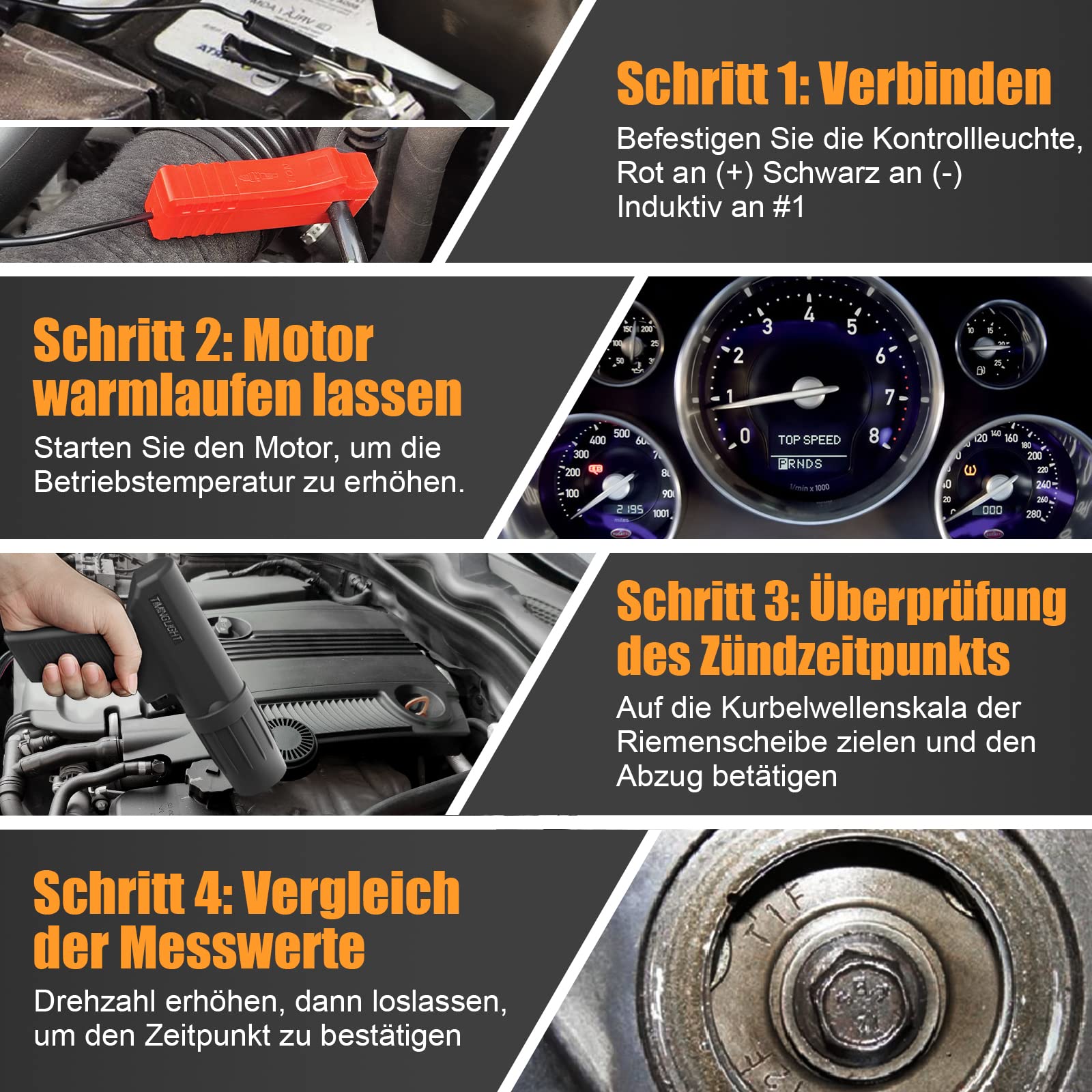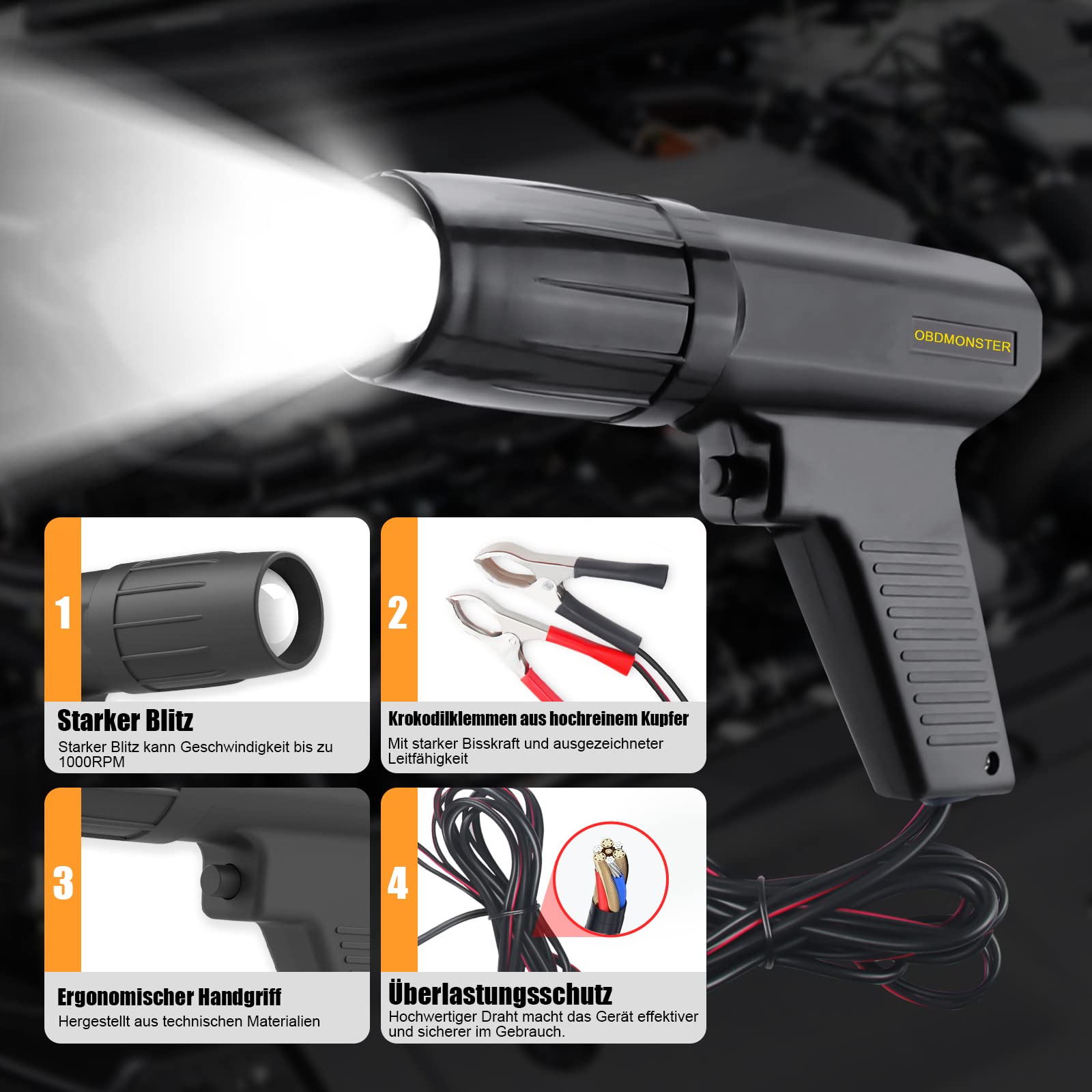 ["Ignition Timing Light: Designed to control the ignition of your car to get the best performance you can. Suitable for cars, vehicles, motorcycles, marine, all two-stroke and four-stroke gasoline engines, easy to operate with 12V ignition systems.","Gun Grip Design: Ergonomic design with comfortable push buttons, great tactile feel, and easy operation. And the high quality makes it durable.","【Sensor Clips】The sensor clip is red and black to distinguish positive and negative poles, easy to use and safer. It is a sliding inductive pickup for clamping, for easy and secure connection.","Advanced Function: Can intuitively test the ignition timing scale on the engine flywheel or pulley to adjust accordingly. Can detect the vehicle knock suppression control system and the vacuum advance angle control system, change the advance angle with speed change.","Attention: The power supply is 12V with red connection to positive and black to negative. The high-voltage wire induction clamp is clamped to the high-voltage line of the cylinder, with the arrow on the induction clamp pointing to the direction of the spark plug for normal operation."]