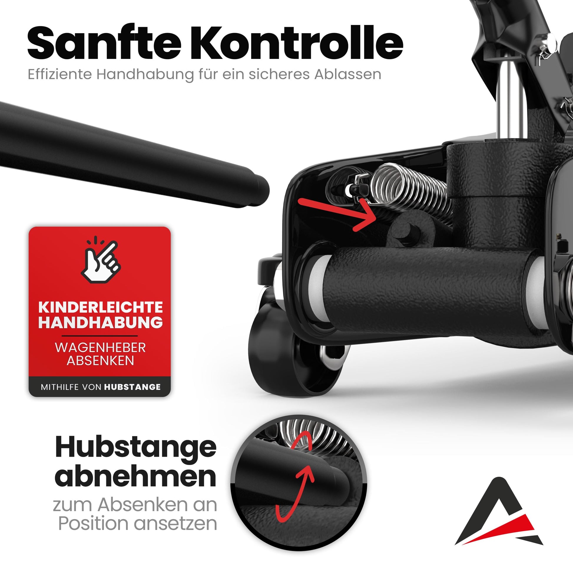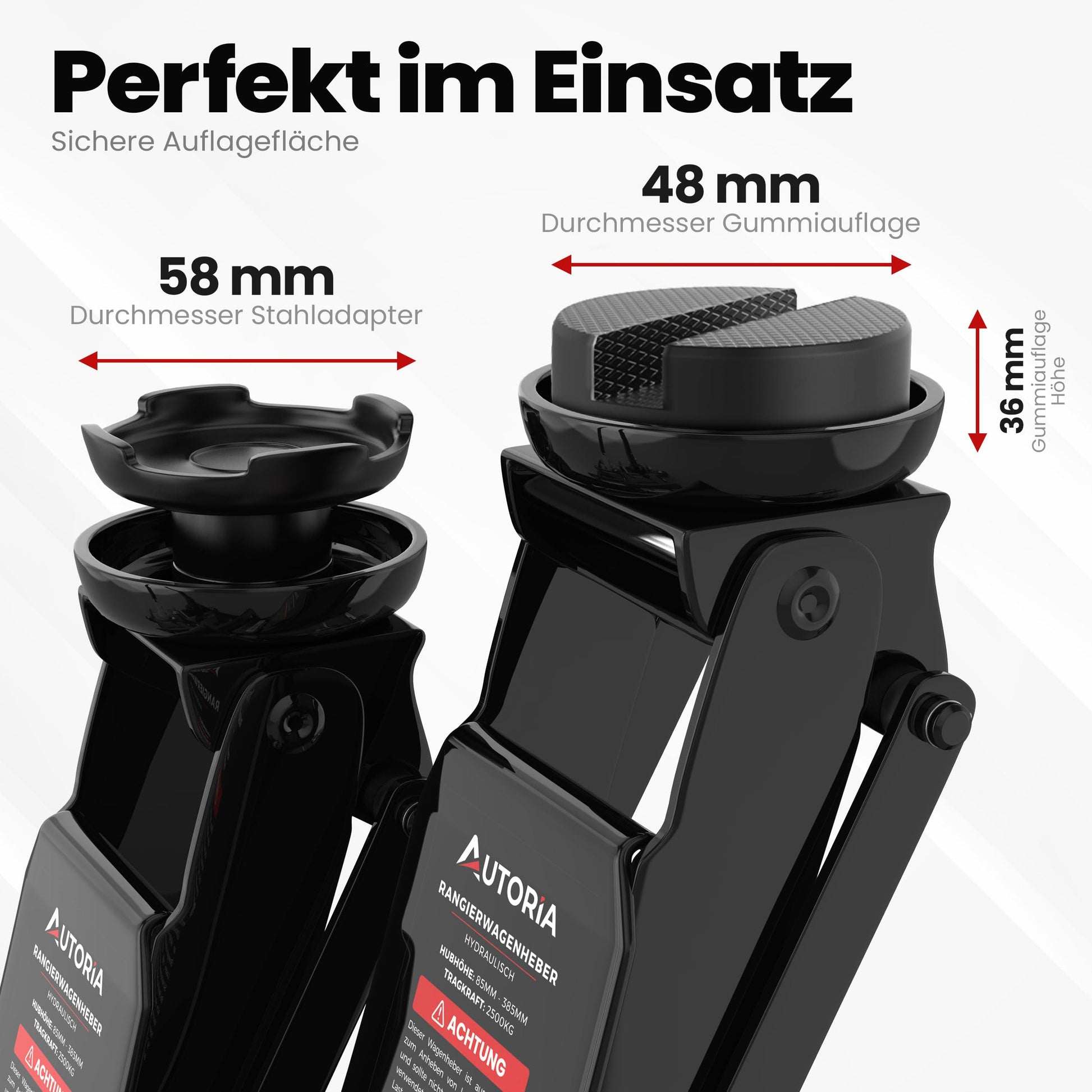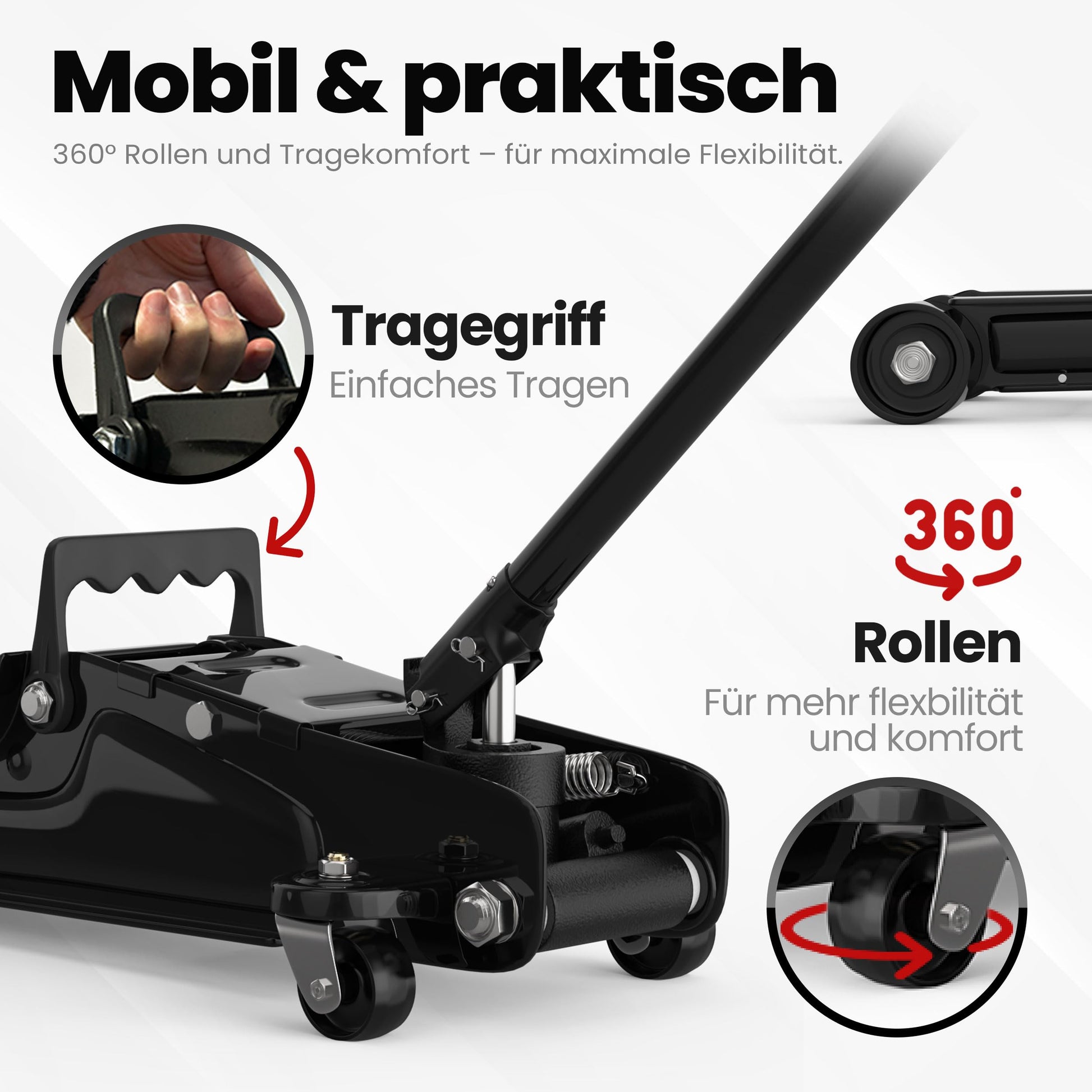 ["Sturdy AUTORIA Jack 2.5T - up to 2,500 kg load capacity: Reliable hydraulic trolley jack for vehicles of all kinds - ideal for cars, station wagons, sedans, vans or lowered cars.","Low-profile - lifting range from only 85 mm to 385 mm: Extra low entry allows easy drive-under even for sports cars - at the same time high lifting capacity up to 38.5 cm for comfortable working.","Includes sturdy carrying case - optimally transportable: The practical plastic case protects the jack during transport and ensures order in the garage, workshop or trunk.","3x rubber pads + 1x adapter - all included in the set: Gentle support for sills & underbody - anti-slip and cushioning for maximum safety in any application.","Full metal construction - durable and low maintenance: Hardened steel frame, high-quality paint against corrosion - for long-term use in the workshop, garage or during tire changes.","Ergonomic pump handle & integrated safety valve: Effortless lifting through long lever action - with overpressure protection valve for maximum safety during use.","Ideal for hobbyists & professional mechanics - reliable jack for every application: Whether tire change, maintenance or lowered vehicles: this hydraulic jack is the perfect all-rounder for your car."]