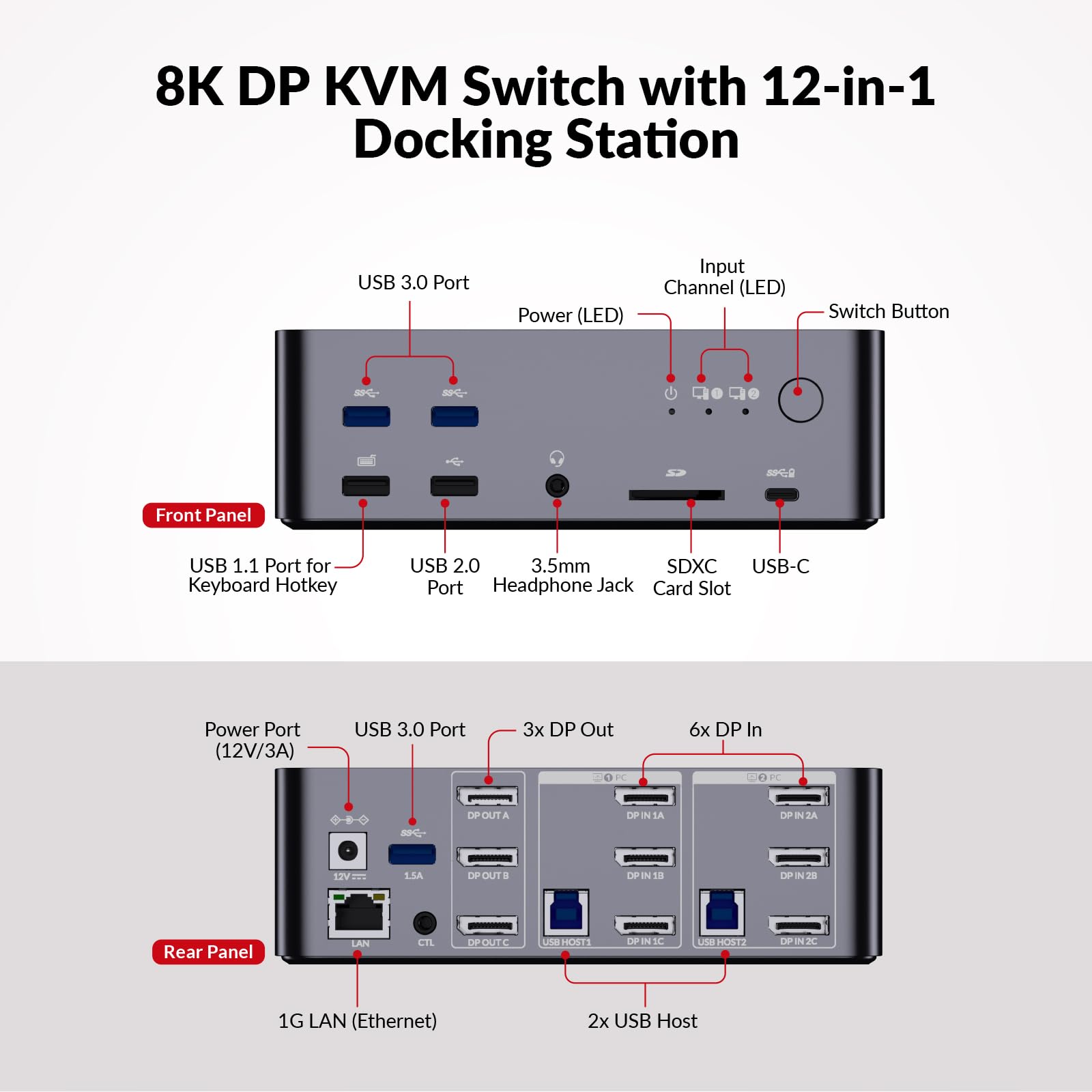 "ăPowerful 12-in-1 docking stationăEasily share a variety of desired peripherals between 2 PCs, including 3x USB 3.0, 1x USB 2.0, 1x USB 1.1 (for keyboard hotkey), 1x USB-C, 1x 1G Ethernet, 1x 3.5 mm headset, 1x SD card, and 3x DP out. Build a powerful workstation in no time.",