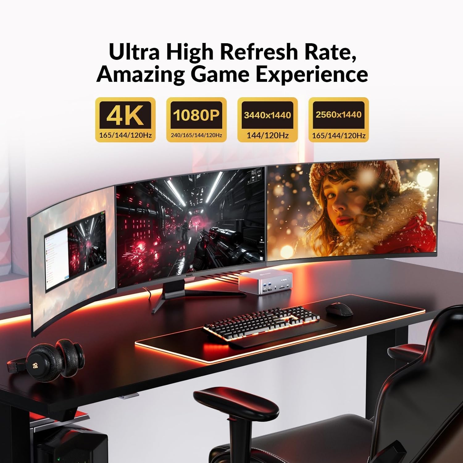 "ăUltra-High Refresh RateăSupports 4K@165/144Hz, 3440x1440@165/144/120Hz, 2560x1440@240/165/144Hz, 1080P@240/165Hz, etc. Enjoy super smooth images and become a winner in your high-speed racing games.",