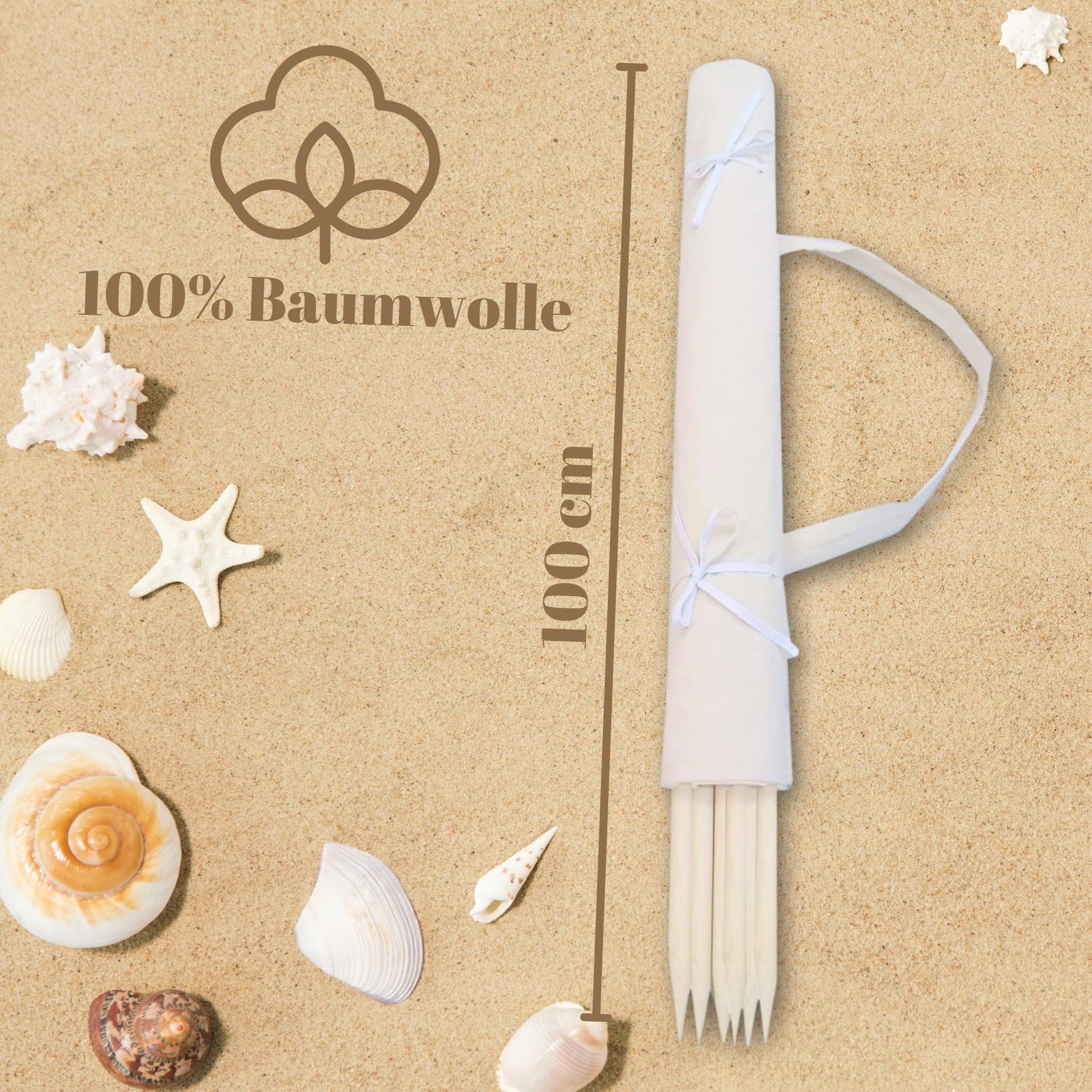 ["100% Natural Cotton: Made from pure, untreated and undyed cotton - for an authentic, eco-friendly look","Optimal Beach Protection: Ideal for shielding from wind, sand, and curious glances - provides more privacy and comfort outdoors.","Customizable Design: Let your creativity run wild - paint the windbreak with textile paints or markers (not included) or enjoy the natural color.","Practical Dimensions and Features: Fabric height approx. 80 cm, wooden pole height approx. 100 cm, total length 8 m, including 7 sturdy wooden poles and straps for a secure stand.","Easy Assembly & Versatility: Quick setup and flexible use in the beach, garden, or balcony area - a must-have for those who value natural visual and wind protection."]