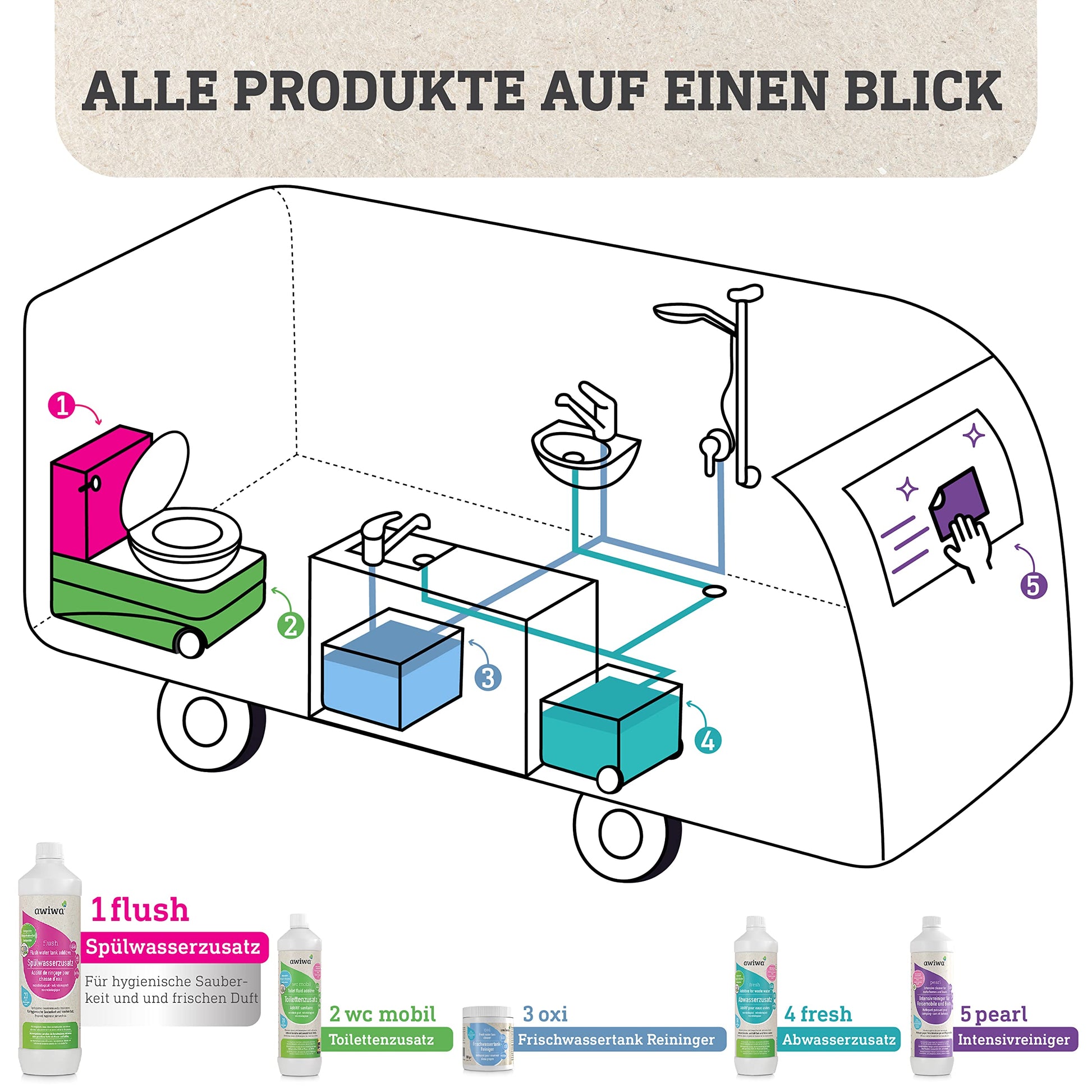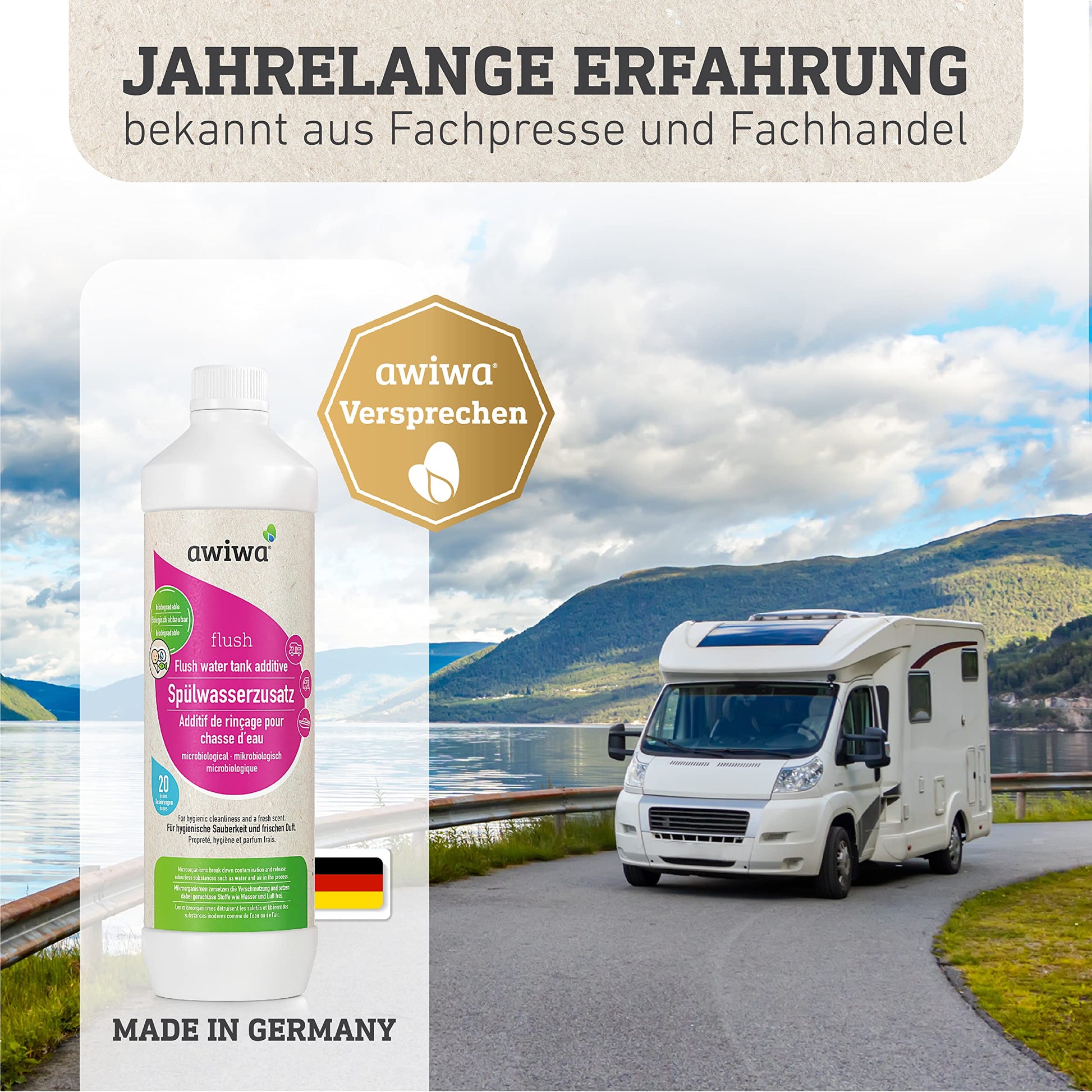 awiwa flush Camping Toilet Additive for Flush Water Tank (1.0l) - microbiological flush water additive for camping toilets - highly effective concentrate for hygienic cleanliness & long-lasting freshness