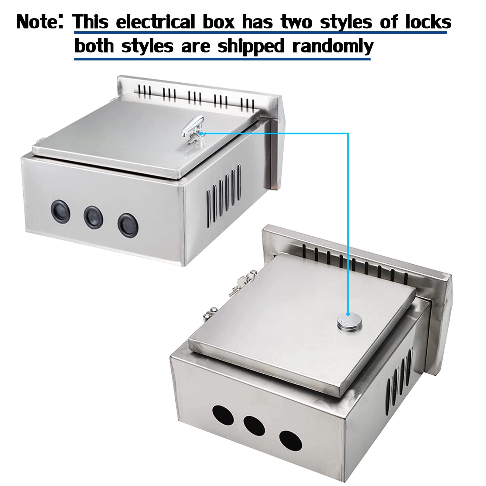 ["304 Stainless Steel Enclosure: The electrical box is made of professional 304 stainless steel with a polished surface to prevent rust and rain corrosion. The cut is flat and smooth to prevent cable scratching, and black and white stuffing glands are used to distinguish incoming and outgoing wires.","Weatherproof Design: All ventilation openings are downward facing, effectively preventing rainwater from entering the enclosure. The enclosure comes with two different locks at random.","Security Enhancement: The box is equipped with an insulation plate and a removable installation bottom plate, which is corrosion-resistant and durable. The electrical box is one-piece molded, with a thick sealing strip to effectively prevent rainwater and dust from entering. The electrical box is suitable for indoor and outdoor use and has a variety of applications, such as factories, shopping malls, squares, communities, exterior walls, etc.","High-quality Lock Cylinder: High-quality stainless steel metal lock cylinder, extremely strong. The electrical box adopts high-strength hinges to ensure that the door is not damaged or deformed by squeezing. This new type of lock is effective against rain and dust, with reliable structure and durability.","High-Quality Customer Service: If you have any questions about use or purchase, you can contact us through Amazon, and we will do our best to provide you with a satisfactory answer."]