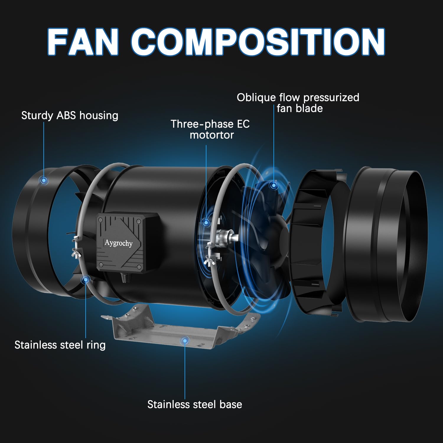 ["Stable Performance】Aygrochy Adjustable Tube Fan with the use of three-phase motors, the work efficiency is more stable. Even if the tube is longer than 10 meters, the tube fan can work normally without reducing power and air volume. Even after prolonged use, there is no loss of performance.