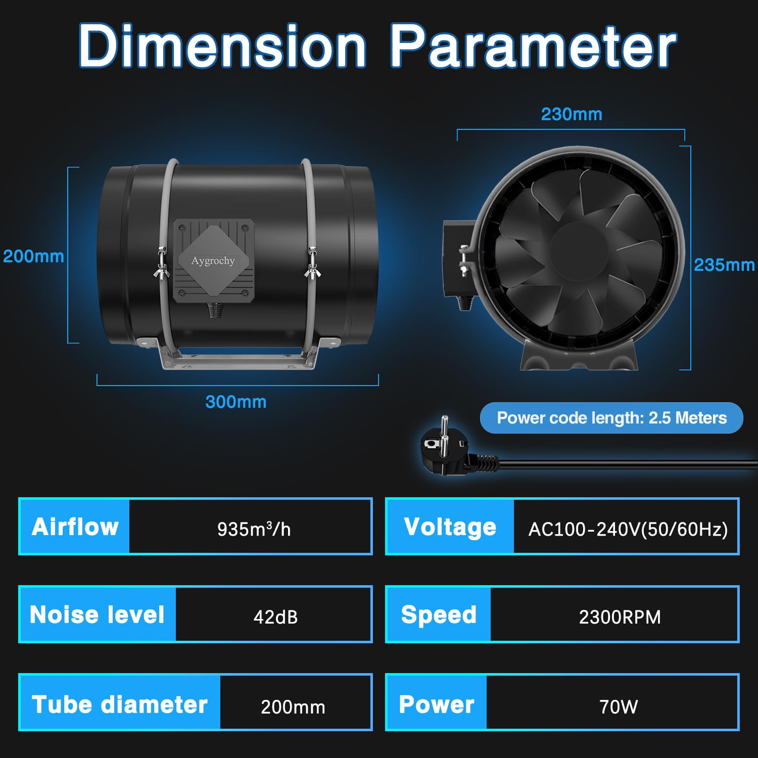 Aygrochy 200mm adjustable duct fan 935 m³/h, EC motor exhaust fan for bathrooms, cooling, boosters, grow tents, hydroponics, home use, ventilation, and exhaust fans.