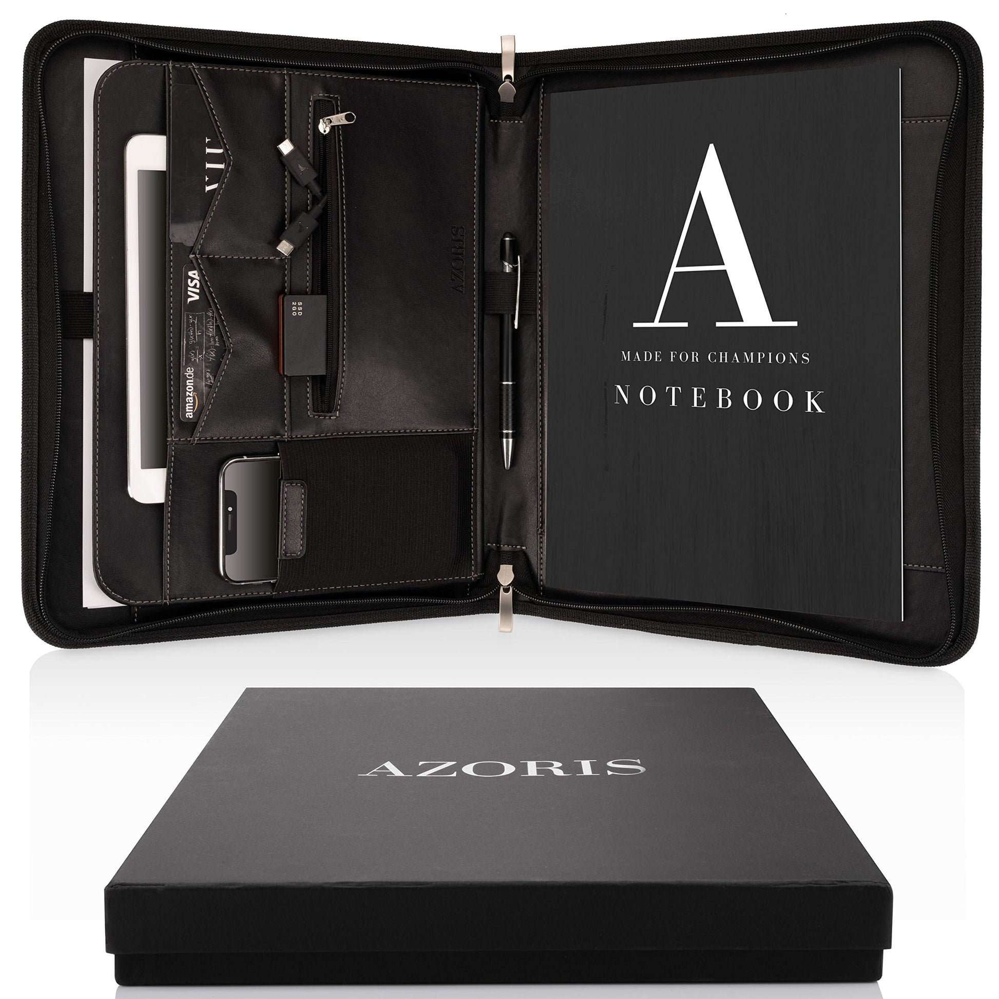 ["MAKE THE BEST FIRST IMPRESSION - You will score points across the board with the professional AZORIS portfolio, whether you are a salesperson, businessman, student, or candidate","PLENTY OF SPACE - In this folder, you will always have room for all your documents, notebooks, pens, cards, smartphone up to 6.5 inches, 11-inch tablet, and much more","EXCELLENT ORGANIZATION - Stop endless searching. You will easily find everything, as you will always be well organized thanks to the 9 differently sized pockets of this folder portfolio","UNIQUE - With this document folder with clear lines, you will leave others behind. The high quality, lightness of materials, and craftsmanship design are unmatched","QUALITY IN EVERY DETAIL - You will love it! The Azoris Premium briefcase is simple perfection. Its impressive functionality also makes it an amazing gift"]