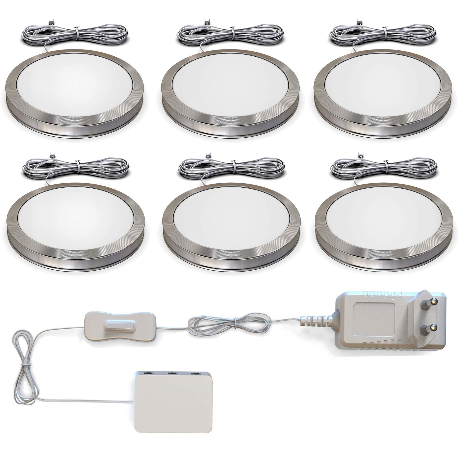 B.K.Licht - Set of 6 under cabinet lights with cable switch, warm white light color, 1.8W each, ideal for kitchen cabinets, LED light strip, cabinet lighting, kitchen lamp, 59x9.5mm, aluminum color.