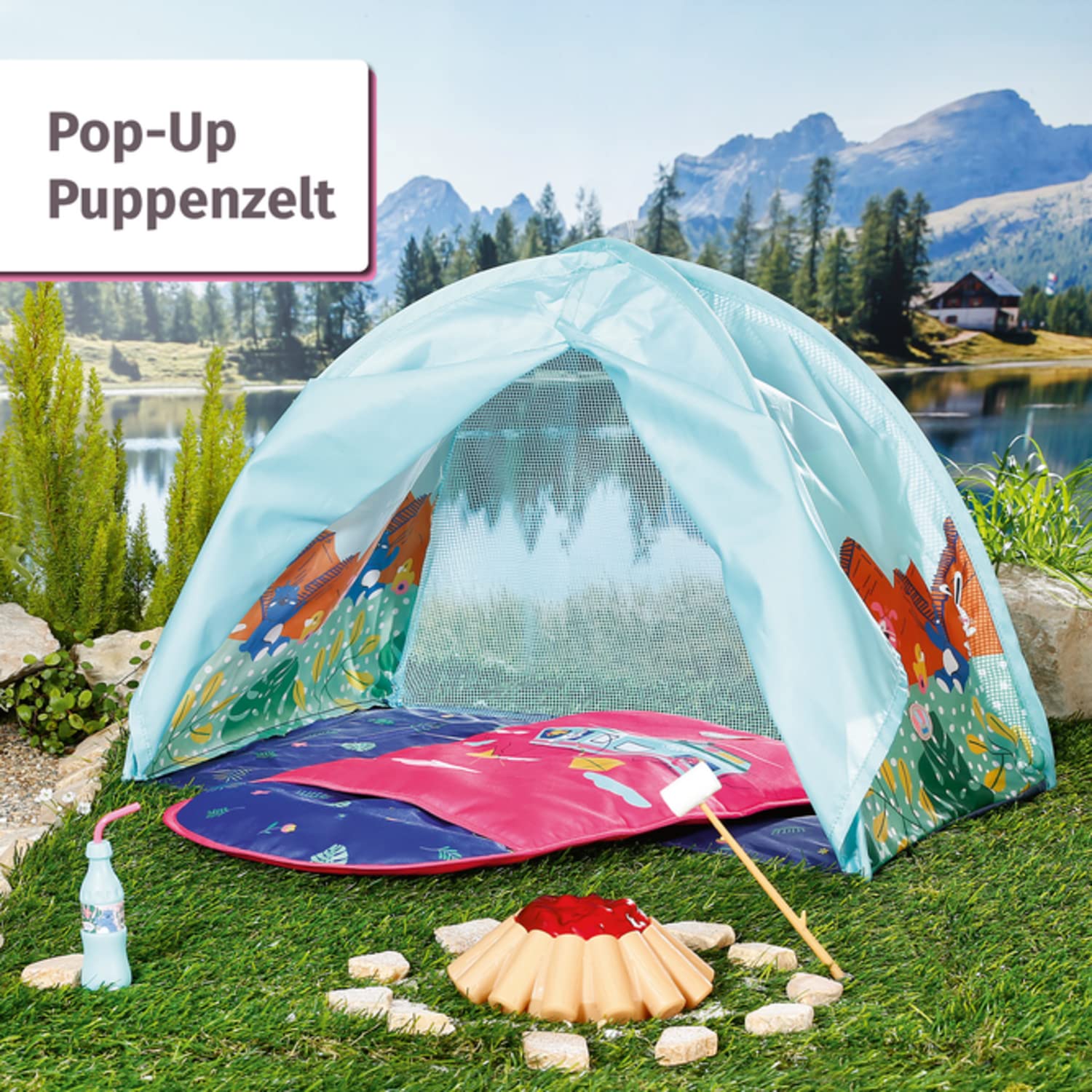 ["✔ POP-UP PUPPET TENT FOR CAMPING: The turquoise camping tent is quickly set up. The outdoor scenery on the outside shows BABY born's animal friends in the mountains.","✔ COMPLETE SET INCLUDING LOTS OF DOLL ACCESSORIES: To ensure the doll is perfectly equipped for the camping trip, a pink doll sleeping bag is also included in the set.","✔ CAMPFIRE WITH LIGHT EFFECT: The campfire flickers and offers an extended, varied playing experience.","✔ REALISTIC ACCESSORIES FOR IMAGINATIVE PLAY: Also included in the package is a marshmallow stick and a water bottle.","✔ SUITABLE FOR MANY DOLLS: This doll accessory can be used for 36 cm and 43 cm tall dolls.","✔ ECO-FRIENDLY - The new BABY born Weekend Camping Set is now available in plastic-free packaging.","✔ AGE RECOMMENDATION: Suitable for children aged 3 years and older.","✔ CONTENTS: Doll accessory set consisting of tent, sleeping bag, campfire, marshmallow stick, and soda bottle."]