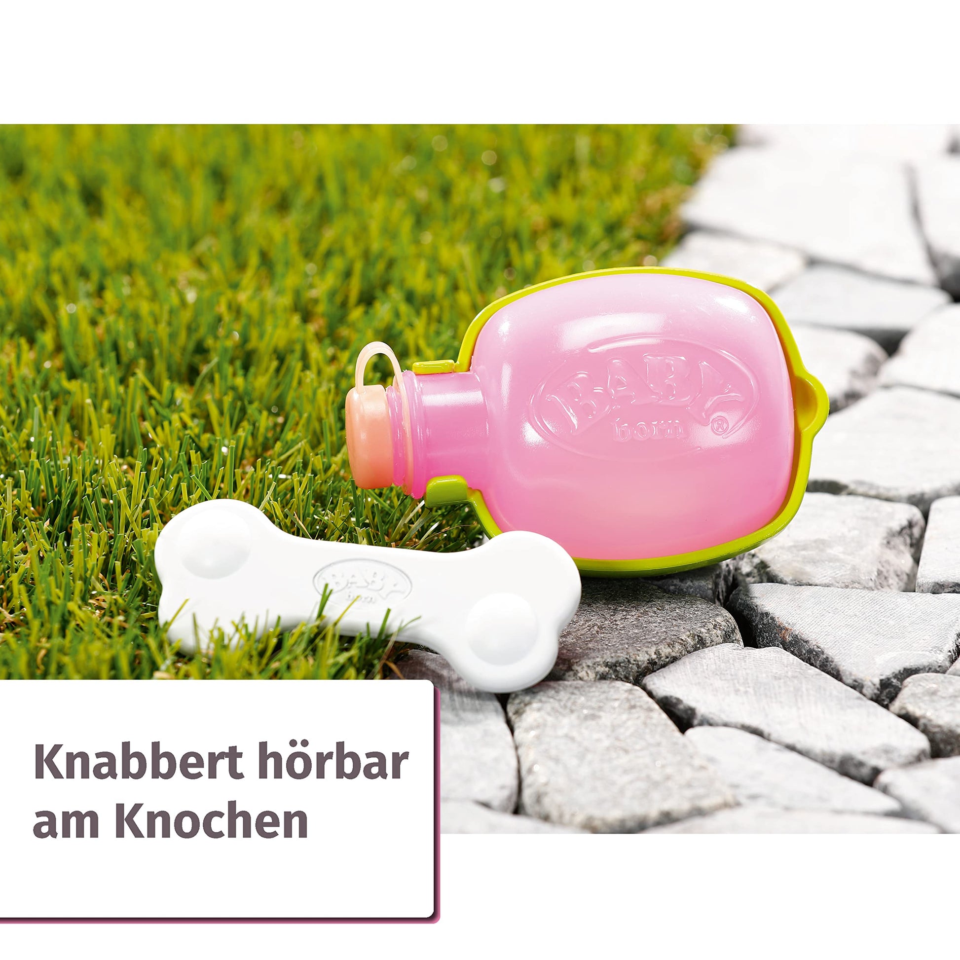 "QUALITY PROMISE: The set also includes plenty of BABY born accessories: a collar with pendant and a bottle with bowl. The electronic dog for kids is well-made. The BABY born dog is plastic-free packaged."