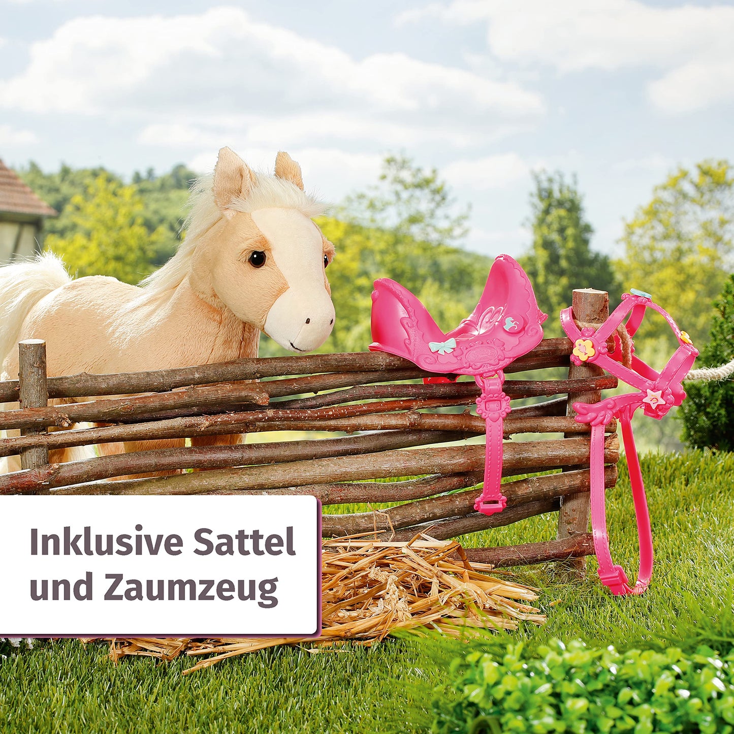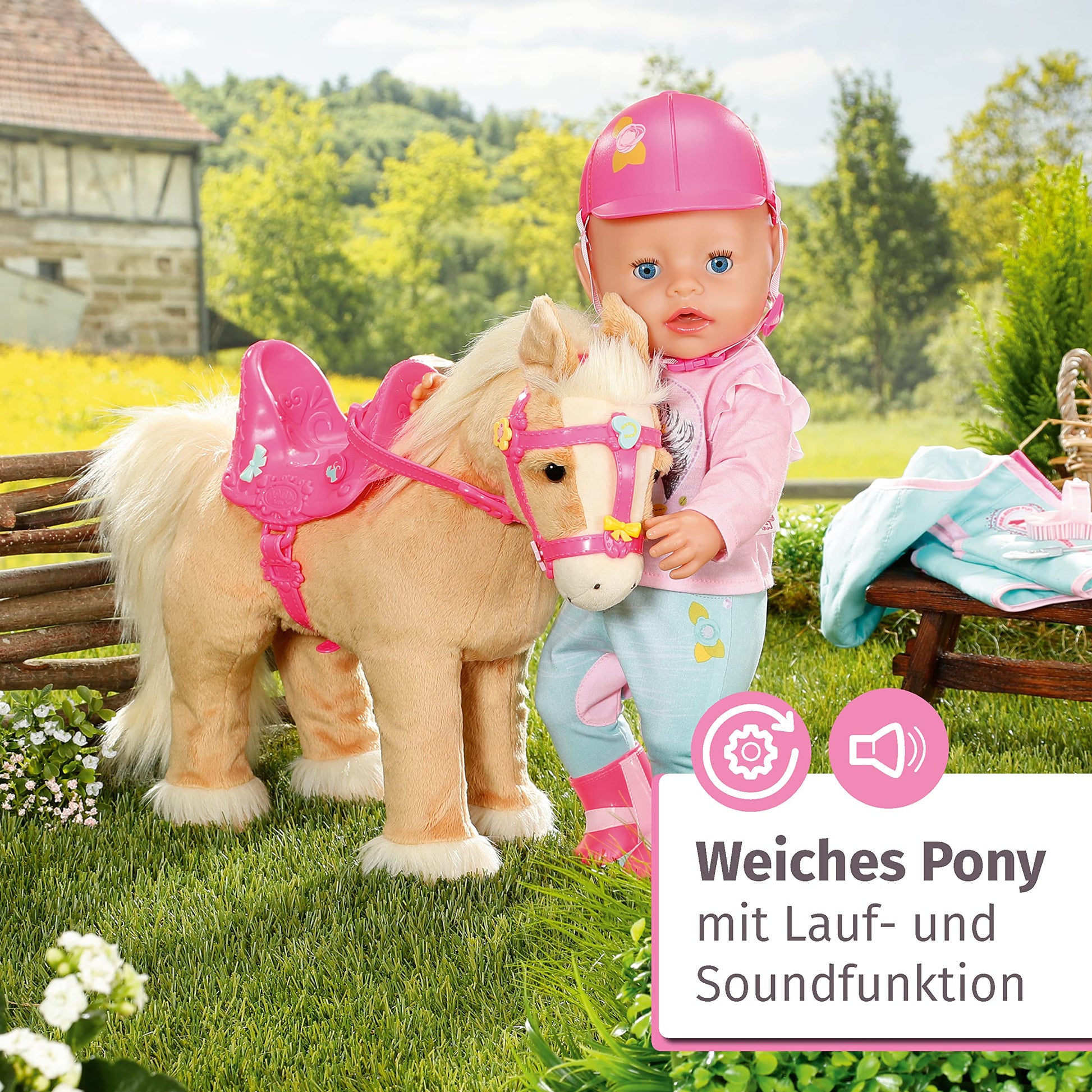 ["Product 1: TOY HORSE WITH FUNCTION: The BABY born doll horse offers interactive fun for children aged 3 and up, with its soft fur and styleable mane. The functional pony can walk and has various sound functions.","Product 1: BABY BORN PONY: The horse for BABY born neighs when its right ear is pressed. Pressing the left ear makes the BABY born horse move. Trotting and horse noises can be heard. Pressing the left ear again stops the horse.","Product 1: HORSE FOR DOLLS: The BABY born functional horse comes with lots of accessories, such as a saddle and bridle that can be decorated with 10 stickers. Batteries (4 x LR04/AAA) are required (not included).","Product 1: QUALITY PROMISE: This BABY born horse is original BABY born accessories. The horse toy is of high quality and ensures long-lasting fun. The horse for BABY born dolls comes in plastic-free packaging.","Product 2: A DRESS FOR ICE PRINCESSES: The doll dress consists of a blue skirt with snowflakes and a glittering top; The BABY born accessory is suitable for children aged 3 and up","Product 2: BABY BORN ACCESSORIES: In addition to the silver shiny doll tiara, the clothing set also includes a silver dress hanger and cute little white ice skates","Product 2: IDEAL FOR SMALL CHILDREN'S HANDS: The outfit is made in an easy fit style and can be easily put on and taken off even by the smallest children's hands","Product 2: QUALITY PROMISE: This doll accessory is an original accessory for the BABY born brand play doll; It is well-made and ensures long-lasting fun"]