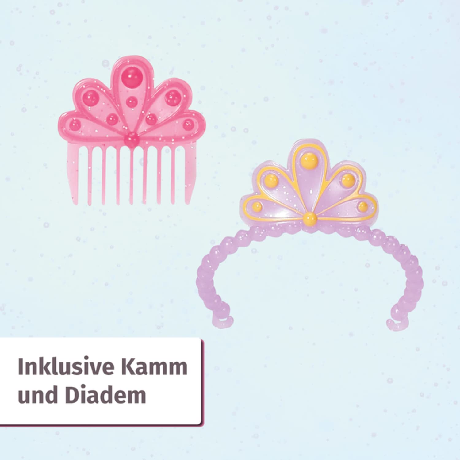 High-quality hair for combing and styling: The mermaid wears a purple tiara in her long pink hair. The hair can be styled into new hairstyles with the comb.