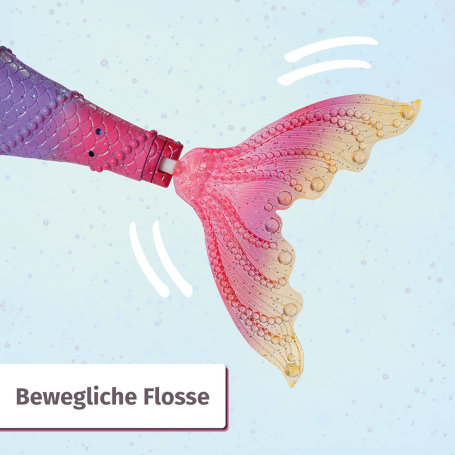 "Mermaid with swimming movements: The 18-inch doll's fin is colorful and adorned with glitter elements. It moves when in contact with water.