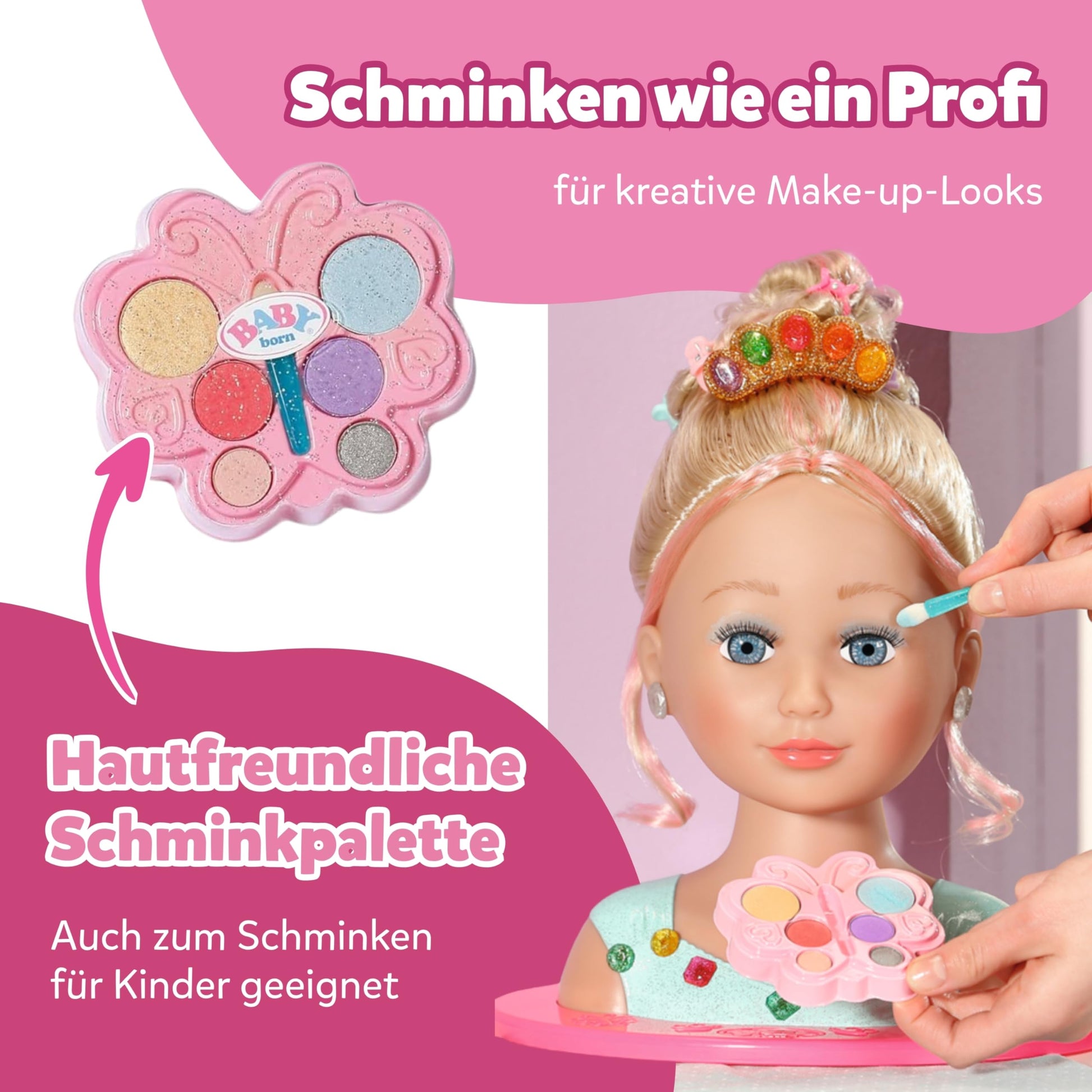 ["CHILDREN'S HAIR STYLING HEAD: The makeup head for children aged 3 and up with its high-quality, blonde hair including delicate colorful highlights can be easily styled with hair ties, hair clips, pins, and a brush.","HAIR STYLING DOLL WITH MAKEUP: The doll styling head is perfect for young makeup artists who can create beautiful makeup looks with the colorful makeup palette - all with skin-friendly colors suitable for children's skin.","DOLL MAKEUP HEAD FOR CHILDREN WITH LOTS OF BABY BORN ACCESSORIES: The styling set includes a total of 33 accessories from BABY born. The highlights are the colorful gem pins for decoration, as well as the transparent glitter tiara and small earrings.","QUALITY PROMISE: The doll makeup head is an original brand product from Zapf Creation. The children's hair styling head is high-quality and guarantees long-lasting fun. The makeup head is also plastic-free packaged.","INCLUDES: BABY born Sister Styling Head Princess including makeup palette, brush, 4 clips, 8 pins, 4 hair ties, tiara, and 14 gem pins. Height of the makeup head: 27 cm"]