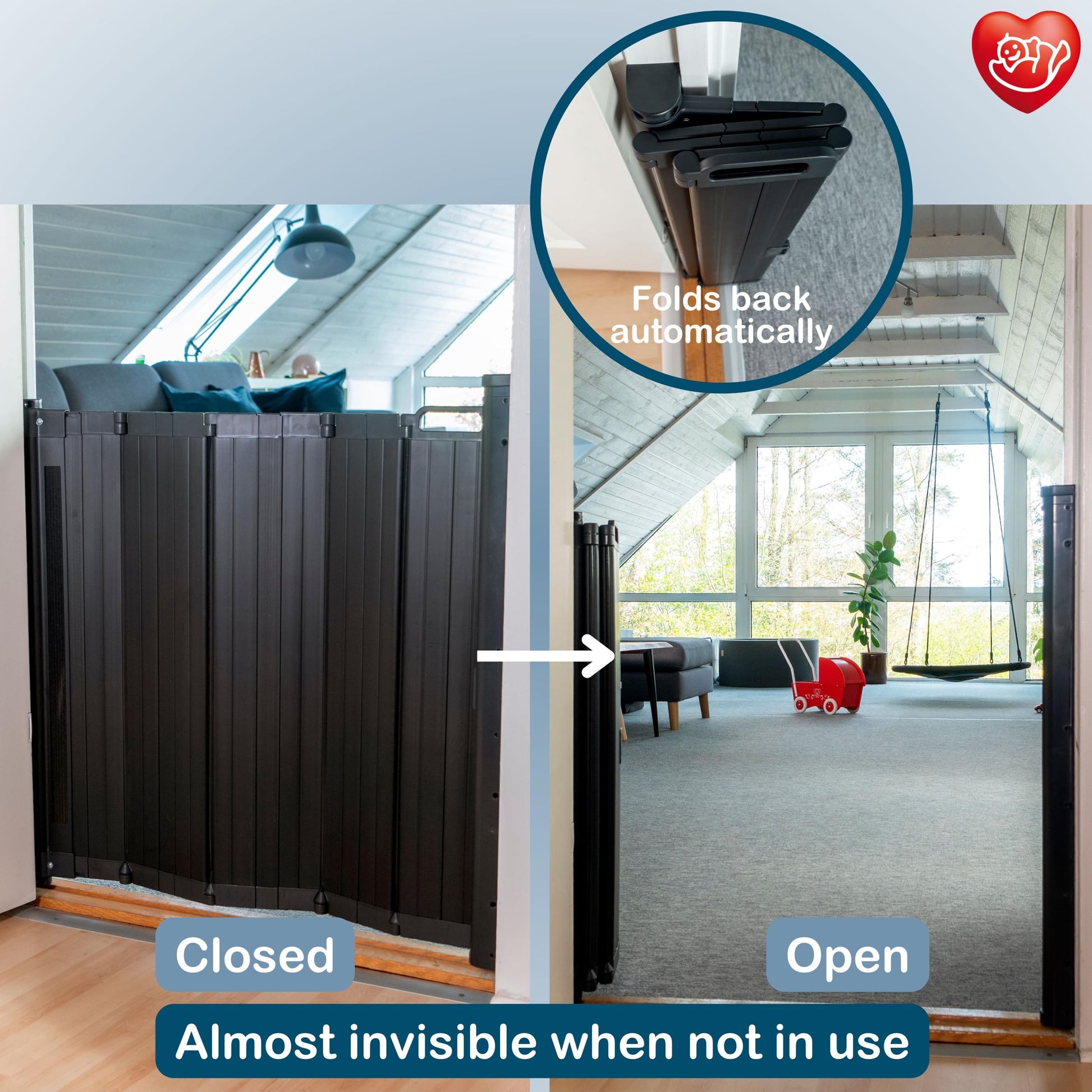 INNOVATIVE AUTO-RETRACTABLE DESIGN: The Baby gate automatically folds back when opened, creating an extra wide passage that is out of the way when not in use. It is slim and nearly invisible when retracted, saving space and increasing convenience.