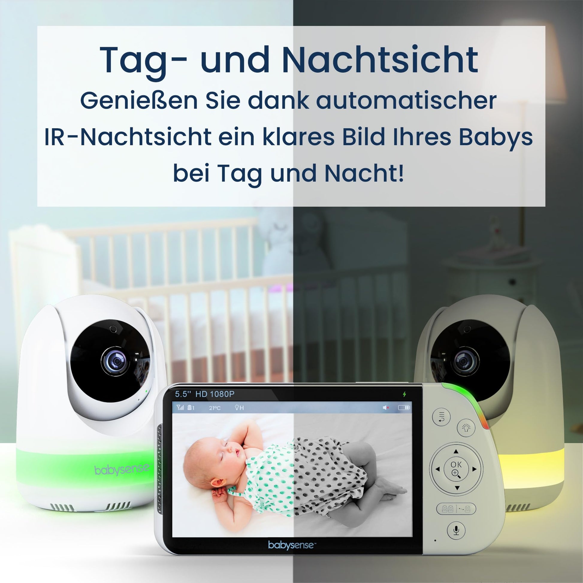 "Hack-resistant and high-resolution view: The 1080p Full HD image on the large 5.5-inch LCD display provides a crystal clear and secure view. Enjoy the remote pan and tilt function as well as up to 4x zoom with a range of 300m. Full-HD display with PTZ camera and split-screen option: This HD video baby monitor is equipped with an HD camera and a split-screen option (when more than 1 camera is paired), so both cameras or babies can be displayed side by side on the same screen. Connect up to 4 cameras in different rooms. Soothe and comfort your baby: Use the two-way audio function, white noise, or pre-installed lullabies to calm your baby from afar. Watch your child around the clock in the nursery thanks to IR night vision and adjustable RGB night light. Don't miss a single moment: We use a revolutionary 5000mAh battery and an energy-saving mode that automatically activates the monitor based on your baby's sounds. Invest in your peace of mind: Our video baby monitor comes with an HD PTZ camera that does not require a Wi-Fi or internet connection (no hacking risks) and allows you to sleep better at night."