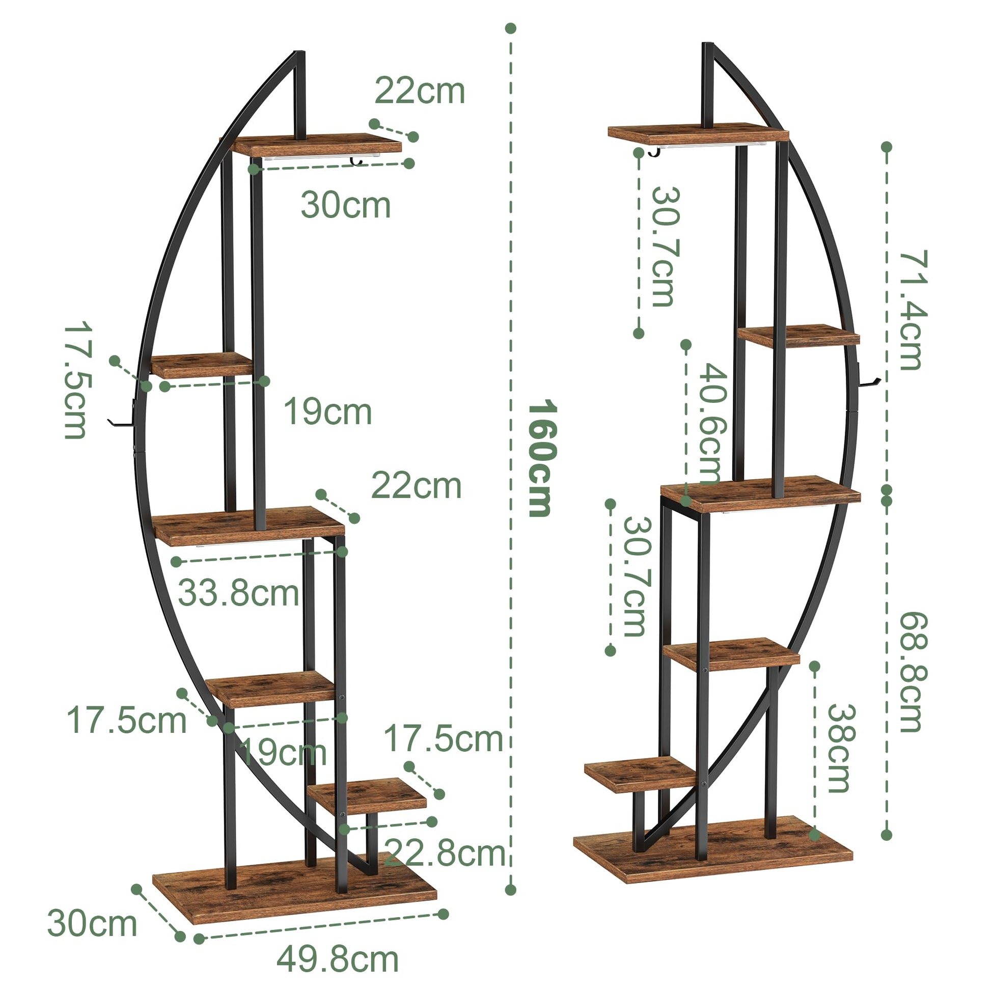 ["Space-saving design for maximum capacity: This 6-tier metal flower stand can hold 6 or more flower pots at the same time. The staggered arrangement allows optimal light exposure to your plant flowers.","Sturdy and durable: Our plant stand features a high-quality metal frame and a reinforced base made of thickened wood, increasing its load-bearing capacity and stability. It is resistant to breakage and deformation.","Elegant decoration and space-saving solution: Our vintage plant stand with a minimalist style combines a wood grain board with a metal frame, perfectly matching your living room, corner, balcony, hallway, garden, or terrace decoration.","Non-slip design and easy assembly: Our flower stand is equipped with round foot pads to protect the floor from scratches and ensure stability. The assembly is easy and effortless with the included instructions.","Versatile applications: Our multifunctional flower pot holder shelf not only serves to display your beautiful plants to enhance your living room and balcony, but can also be used as a bookshelf in the study or showcase family portraits, photos with beautiful memories, and championship trophies in the bedroom."]
