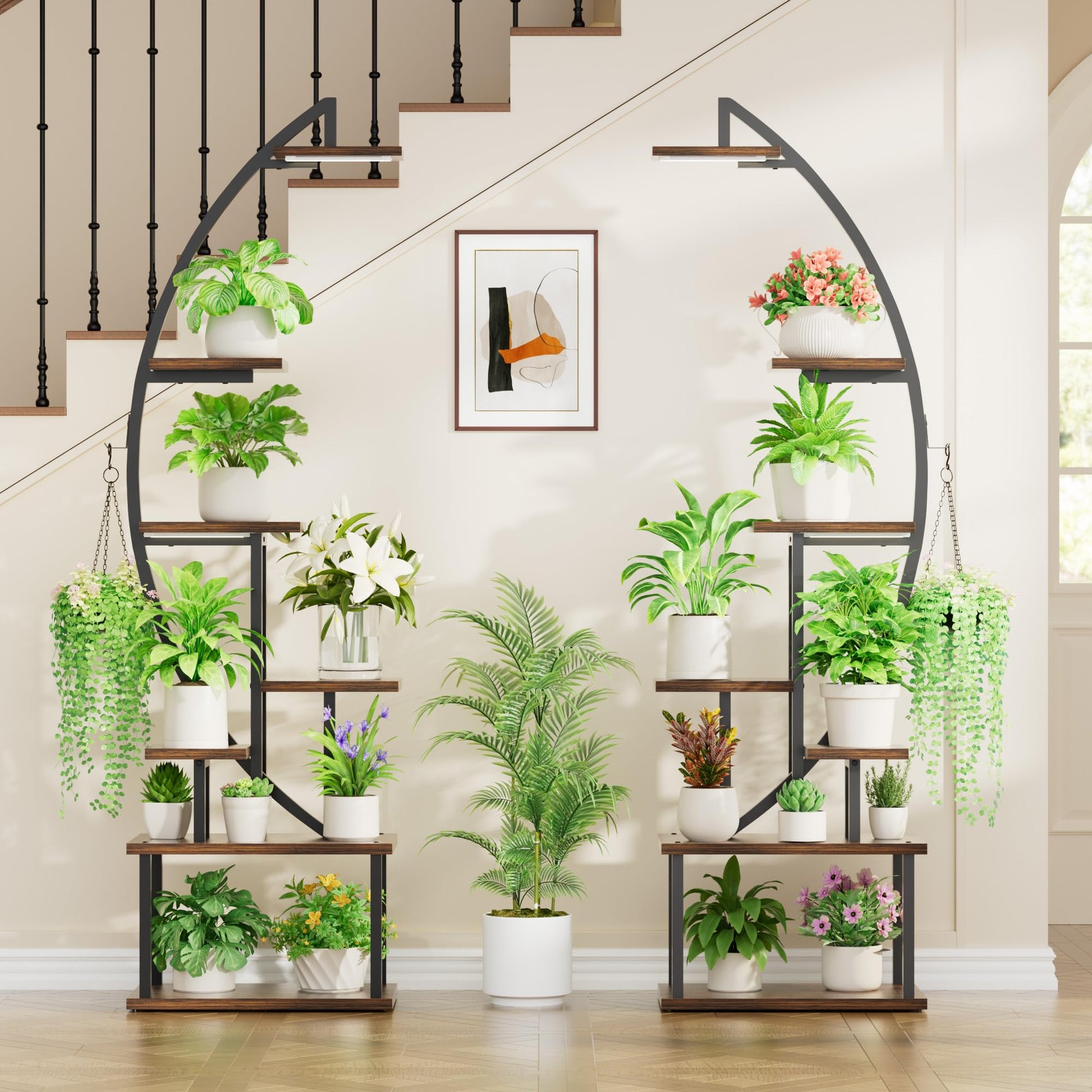 7 Tiered Indoor Plant Stand: This 65 inch tall plant stand set features 7 tiers, 14 pot stands, and 2 hangers, providing ample storage space for displaying as many plants as possible. Some levels can even accommodate two plant pots. Additionally, this plant stand also meets your different requirements for placing books, pictures, collections, awards, knick-knacks, artworks, crafts, and more.