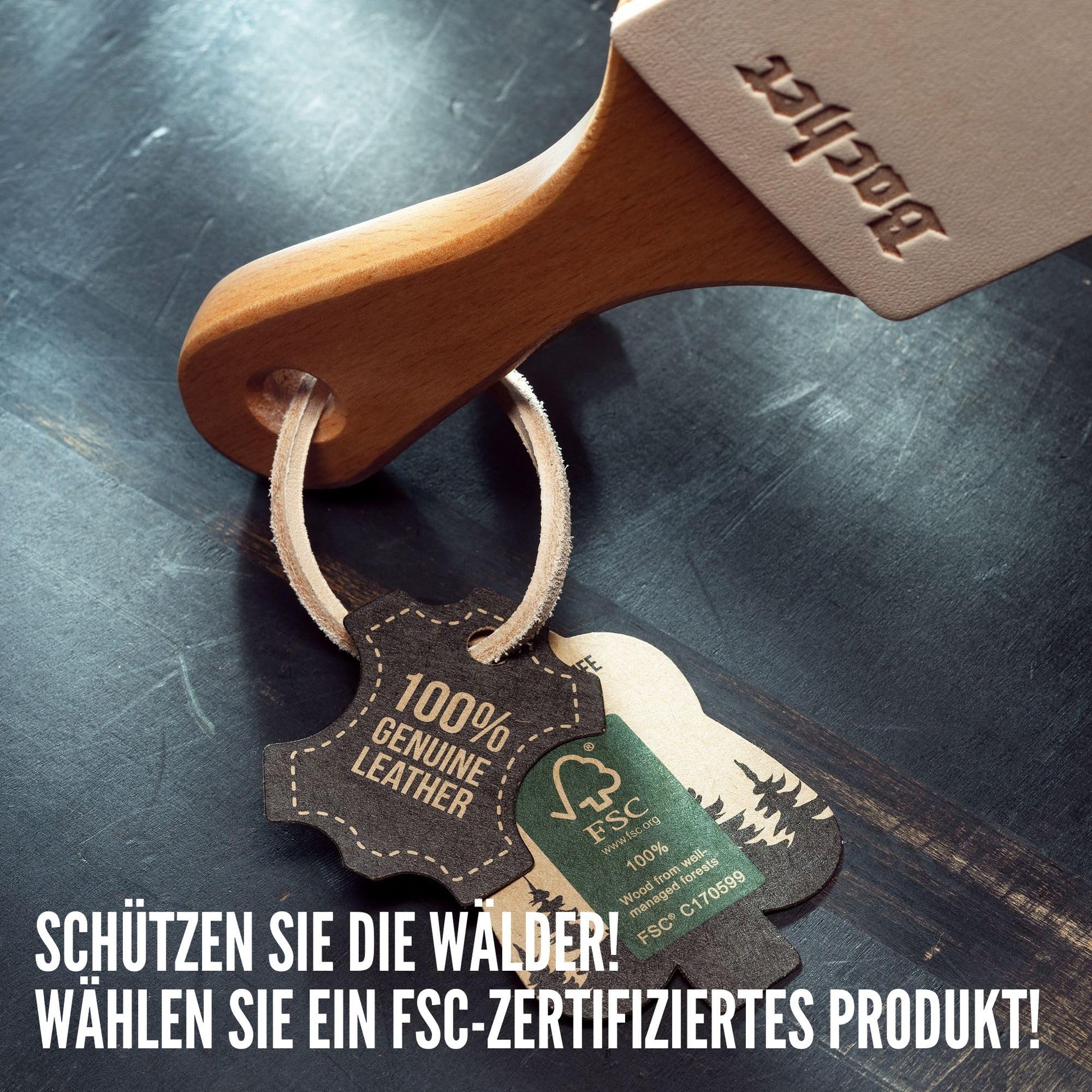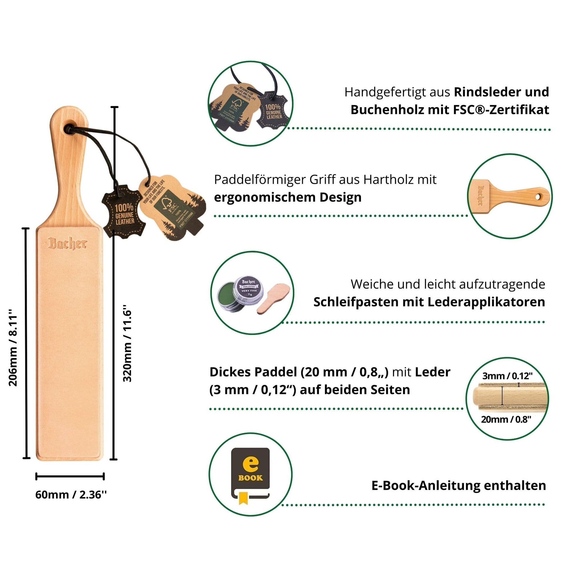 Bacher Premium Leather Strop Sharpening Tool for knives set with 4 x 7g polishing paste. Hardwood paddle handle, covered with 1/8" thick, bark-tanned cowhide.