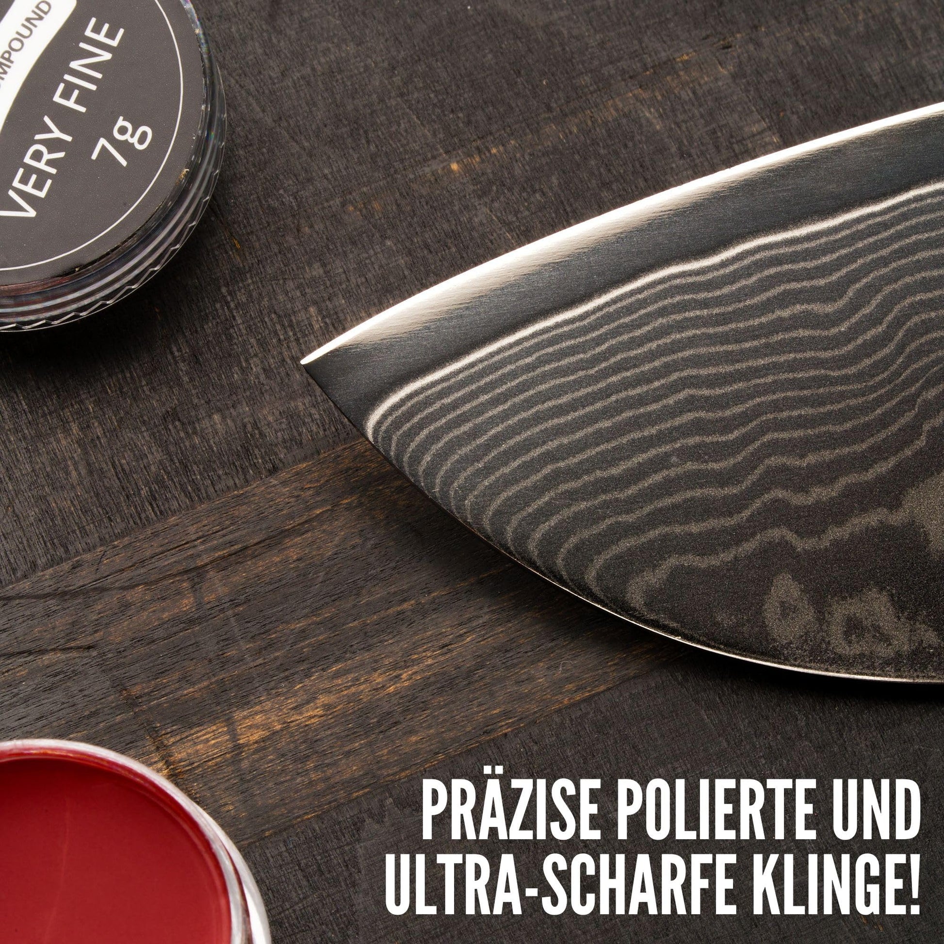 "SPECIAL SHARPENING PASTE: Conditioning balm and 4 grits of a special Bacher sharpening compound are included. Soft and easy to apply, specially designed for strops and sharpening. The balm softens and nourishes the leather with lanolin and beeswax. Each 7g. Approximate grit: Red 2000 (medium), White 5000 (fine), Green 8000 (very fine), Black 12000 (ultrafine)"]