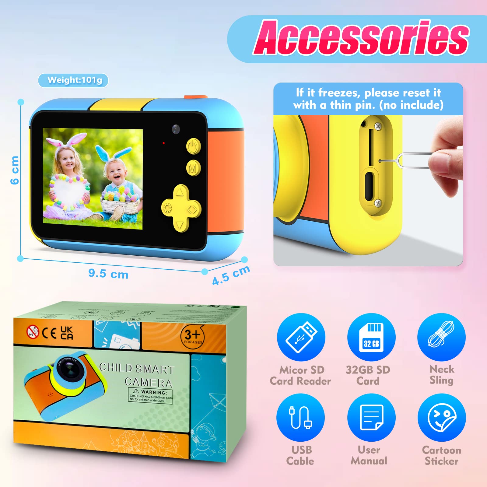 ["【Digital Camera for Kids】Compact and lightweight, this digital camera is equipped with an 8x digital zoom with single button autofocus to zoom in on distant objects and capture all details, then processed with a CMOS sensor to significantly improve the clarity of photos and video resolution of the kids' camera.","【Rechargeable Kids Camera】The digital camera is powered by a 1200 mAh battery that can support 2 ~ 3 hours of recording time when fully charged, it also supports automatic shut-off, which can significantly extend the usage time (please fully charge the camera before first use).","【High Configuration】Built-in with two 20MP Sony lenses and advanced chips, with a 2.4-inch IPS display to protect the eyes, it can capture both photos and videos, significantly improving the user experience of the kids' camera and stimulating children's interest in photography.","【Multifunctional】Designed for children aged 3 to 10, the kids' camera is equipped with a range of unique features that support autofocus, selfie, self-timer, time-lapse shooting, and smiley shots, which can greatly stimulate children's curiosity.","【Surprise Gift for Kids】With a high-quality ABS rubber housing and a lanyard, this camera is very easy to use and child-friendly, making it ideal for capturing unforgettable moments. Without video games, it is the ideal tool for promoting photography in children, freeing them from the distractions of their phones, and giving them a surprise gift."]