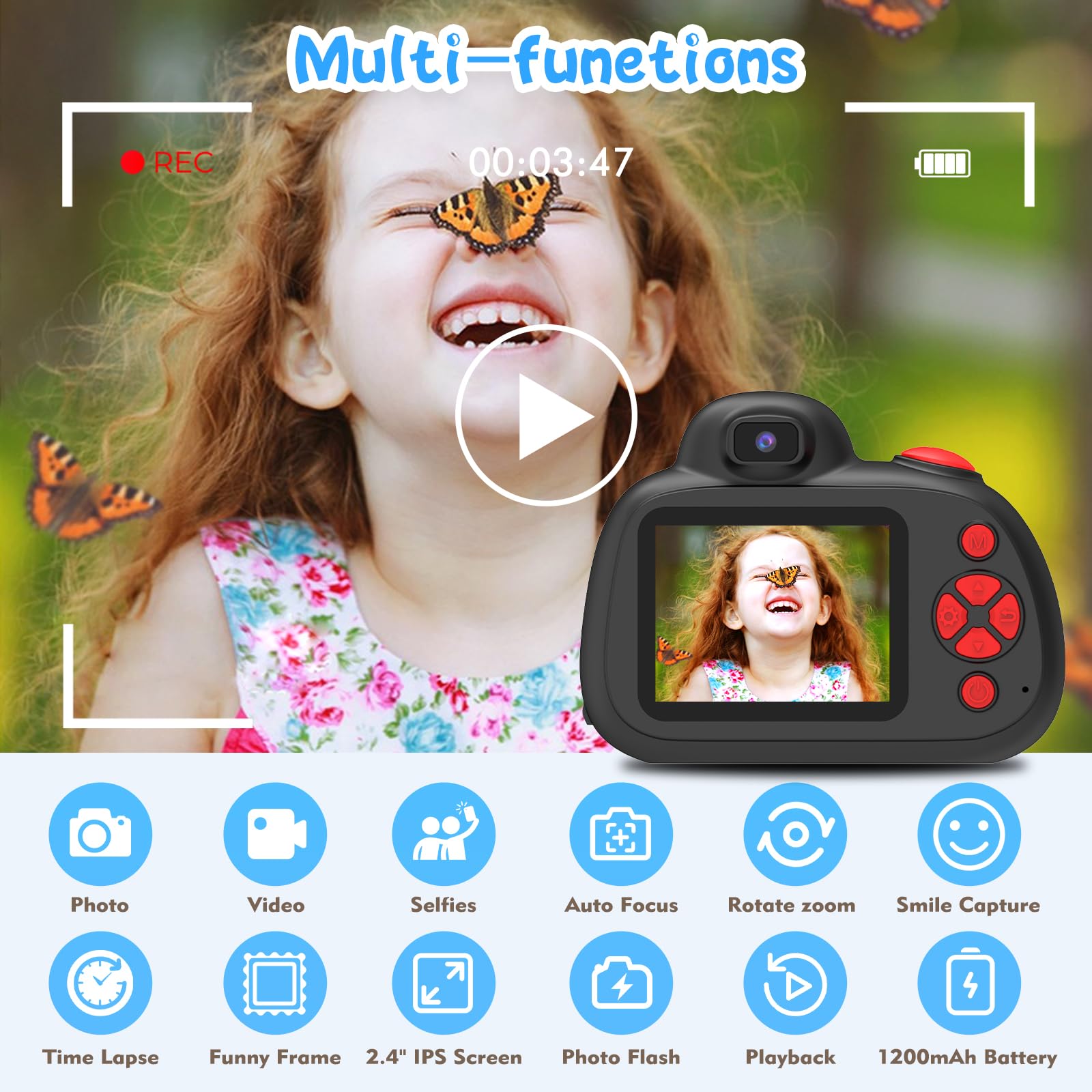 【Rechargeable kids camera】The digital camera is powered by a 1200 mAh battery, which can support 2 ~ 3 hours of recording time when fully charged, it also supports auto shut-off, which can significantly extend the usability time (please fully charge the camera before first use).