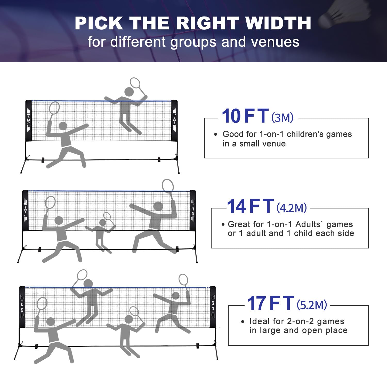 Multi-purpose Sports Net: Available in 3 lengths (3m/4.2m/5.2m) and adjustable heights (85cm to 155cm), the BAGAIL sports net is an ideal tennis, badminton, or volleyball net, in the backyard, on the beach, in the driveway, or on any other flat surface. Have fun, anytime and anywhere!
