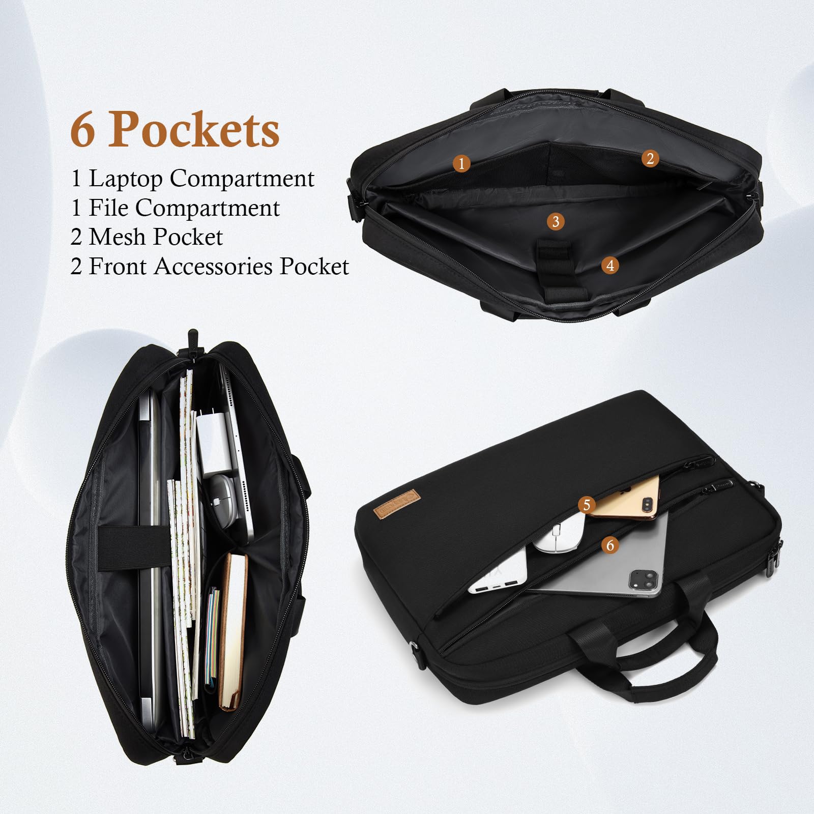 ["【Compatibility】: The size of the laptop compartment of the laptop sleeve is 14.1*10.2*2 inches, compatible with laptops up to a 16-inch screen (less than 16 inches laptop is also fine).", "【4-Layer Protection】: Bagasin laptop shoulder bag is equipped with 4-layer protection for your laptop: 1. The outermost waterproof and scratch-resistant fabric; 2. Elastic EVA padding for slim and smooth shape; 3. EPE foam for shock absorption; 4. Super soft layer.", "【Enough Space】: The laptop compartment of the laptop bag provides more protection for the laptop. The 2 inner mesh pockets and 2 outer front pockets offer sufficient storage space for your laptop accessories and other small devices, such as iPad, phone, adapter, mouse, pen, chargers, cables, headphones.", "【TSA Friendly】: Durable and adjustable shoulder strap and handle of the briefcase allow for easy transportation.", "【Durable】: YKK zipper makes the laptop shoulder bag much more durable."]