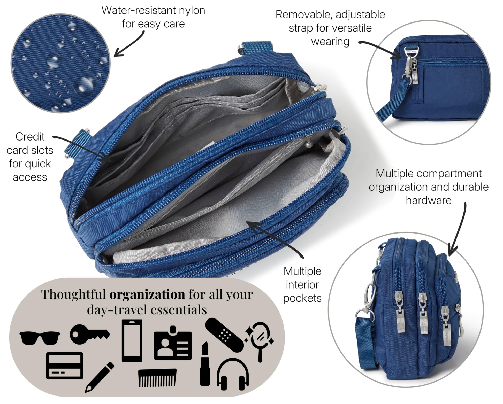 ["Multifunctional: Thanks to a removable 52 inch adjustable strap, the Baggallini bag with triple zipper can be used as a crossbody bag, wallet, or waist pack. Perfect for travel and daily use.","Interior organization: This durable travel bag features six credit card slots, multiple zippered pockets, and a phone pocket to keep your most used items protected and ready.","Machine washable: Don't worry about getting this bag dirty or wanting it to look like new. To wash, remove the strap, place it in a laundry bag or pillowcase, and wash in warm water with mild detergent. Stuff pockets to maintain shape during air drying.","Converts to a waist pack: This bag is as stylish as it is practical, featuring discreet belt loops on the back that allow you to attach the bag to your belt.","Lightweight and waterproof: Our water-resistant crossbody bag weighs only 8 oz and is 6 inches high, 8 inches wide, and 2 inches deep, perfect for all-day travel"]