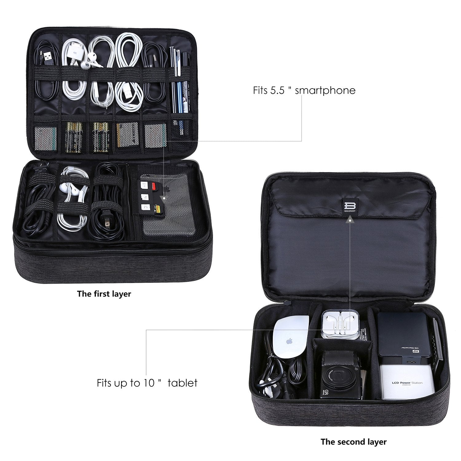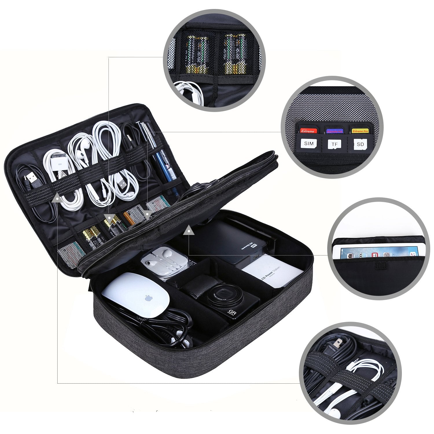 ["Double layer - the upper cable pocket organizes cables, USB sticks, SD cards, charger. The lower storage pocket accommodates power bank, hard drive, spare batteries, 10.5 inch tablet, kindle and other accessories",