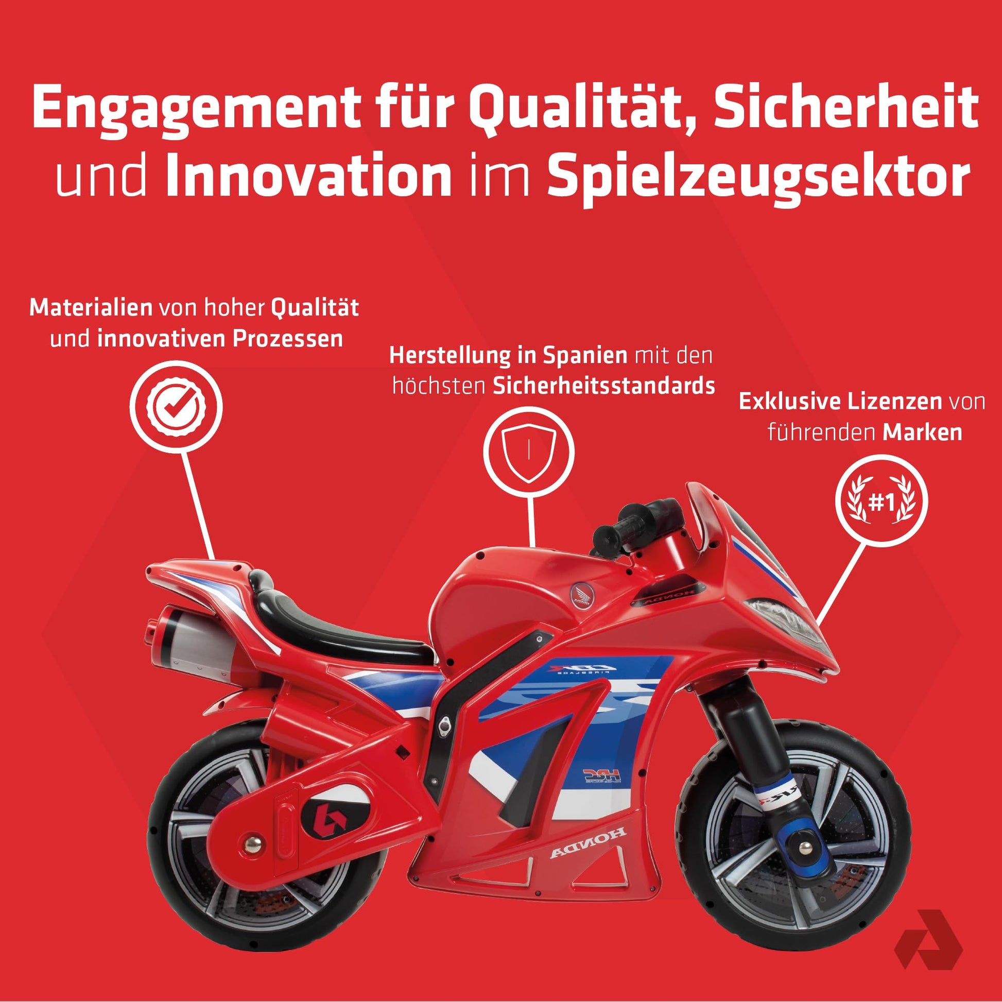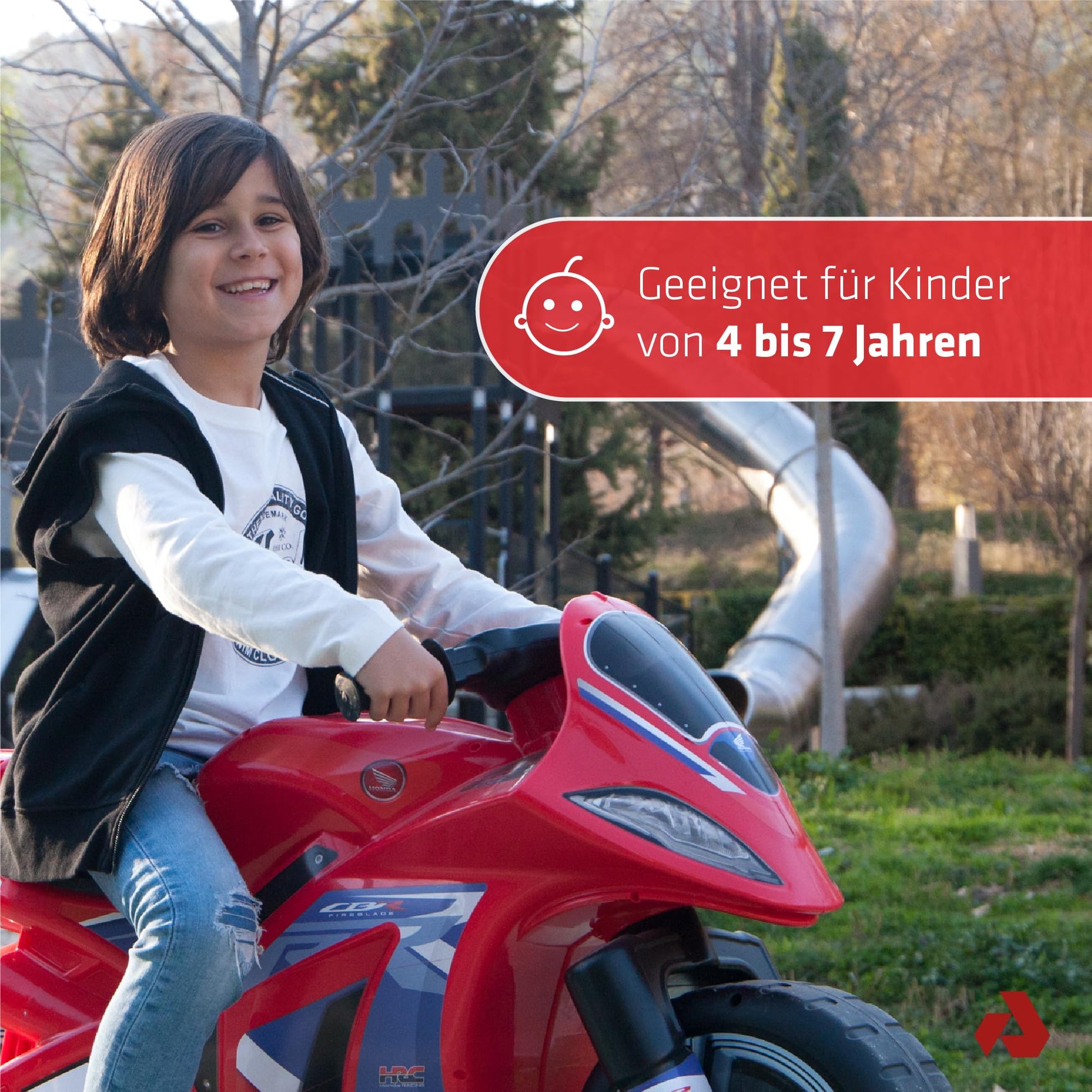 ["XL CHILDREN'S MOTORBIKE FOR BIG ADVENTURES Ideal for children aged 4 and older who want to continue developing their motor skills - with a realistic driving feel and maximum fun while riding (non-electric).", "REALISTIC RACING DESIGN Thanks to the detailed Honda Fireblade decoration and sporty color scheme, children feel like real little racers on the track.", "ERGONOMIC AND COMFORTABLE TO RIDE The well-thought-out design ensures comfort and a natural sitting position. Perfect for longer play sessions indoors and outdoors.", "INTEGRATED CARRY HANDLE FOR PARENTS When the energy of the little riders fades, the integrated handle makes it easier for adults to transport - practical and quick.", "LARGE & STURDY FOR CHILDREN AGED 4 AND UP Dimensions: 99 x 39 x 61 cm - seat height 41 cm - max. weight: 50 kg. Officially licensed by Honda and manufactured in Spain according to EU safety standards."]